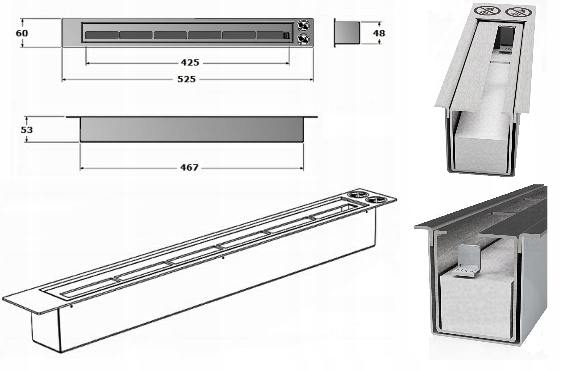 - Пальник: одна лінійна конфорказ сертифікатом TUV, довжиною 53,5 см з ємність 0,7 літра, з поглинаючою вставкою, що підвищує безпеку використання