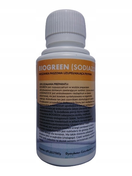 Biogreen (SODIUM NITROGEN) – водорозчинний амінокислотний і рослинний препарат, що містить сорбітол. Лізин, що міститься в препараті, є незамінною амінокислотою в раціоні, оскільки не синтезується в організмі тварин. Ця амінокислота є фактором, що стимулює апетит. У більшості випадків додавання лізину необхідно, коли його всмоктування в шлунково-кишковому тракті порушується або його утилізація значно підвищується (під час линьки, льоту чи періоду реконвалесценції). Сорбітол стимулює дію травних ферментів у тонкій кишці, таких як холецистокінія-панкреозимін. Він полегшує проходження їжі та є важливим джерелом енергії, оскільки під час метаболічних процесів розщеплюється на глюкозу, яка є джерелом енергії для клітин. Він також стимулює відтік жовчі в печінці. Частина сорбіту, що виділяється нирками, стимулює сечовиділення.