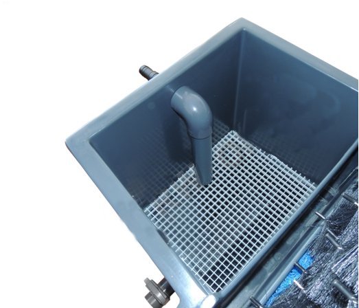 Четверта камера має "серце" всієї системи фільтрів, там відбувається біологічна фільтрація. Друга камера наповнена спеціальними плаваючими матеріалами - Kaldnes, які кладуть у рух через повітряний насос, прикріплений до набору. У воді, насиченій киснем, у формах Кальнса біологічно активна мембрана працює набагато інтенсивніше, ніж на інших статичних фільтраційних носіях. Зони "молодої" мембрани за межами фурнітури, постійно стирання та "стара" зсередини. Процес нітрифікації відбувається більш повно і без небезпеки анаеробних зон. Кожна камера має найпростіший клапан Ø50 мм для легкого та зручного очищення фільтра. Коли клапан закритий, домішки накопичуються внизу камери, фільтр очищають шляхом відкриття клапана, забруднення через виступаючі, вони виходять назовні, ви можете підключити шланг до лиха, що дозволяє, наприклад, скидати бруд у каналізацію поблизу каналізації каналізації.