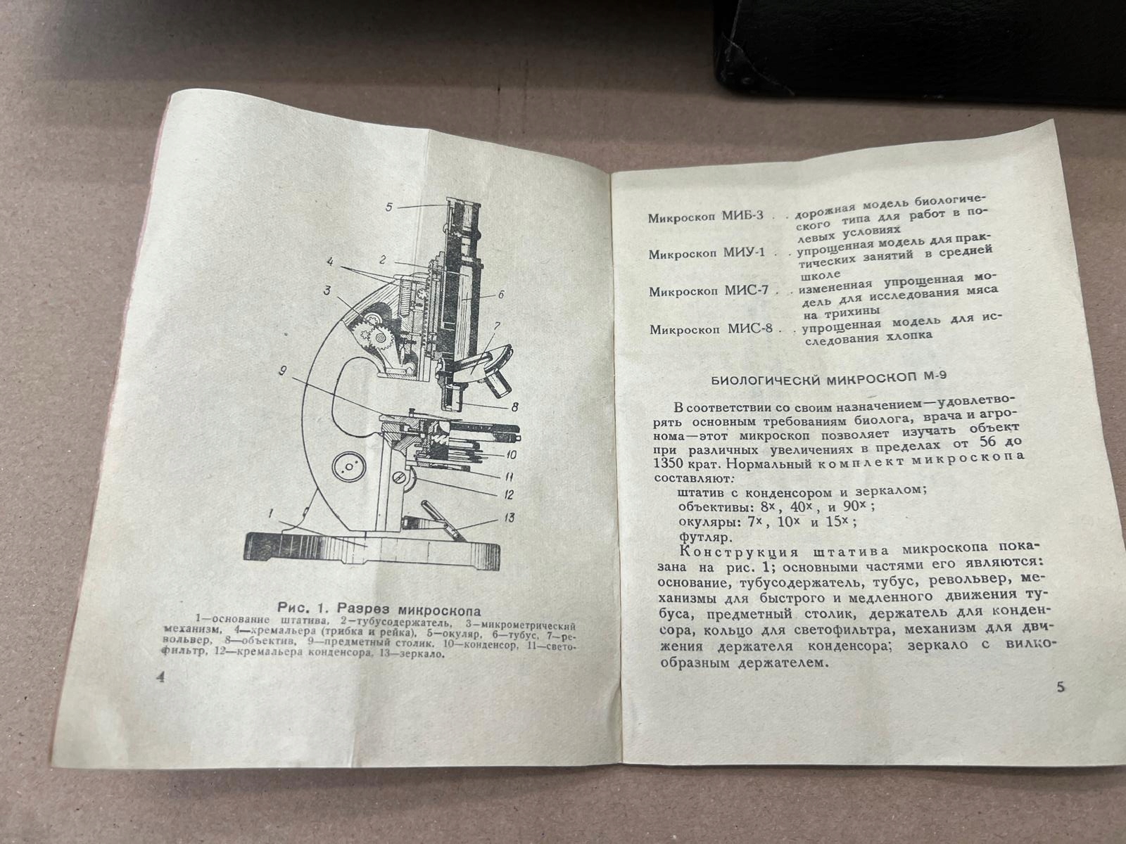 Тип біологічного мікроскопа: MBI, виробництва Другої світової війни, з трьома лінзами, ніколи не використовувався. Передана лабораторії ВМС на рубежі 1950-1960-х років