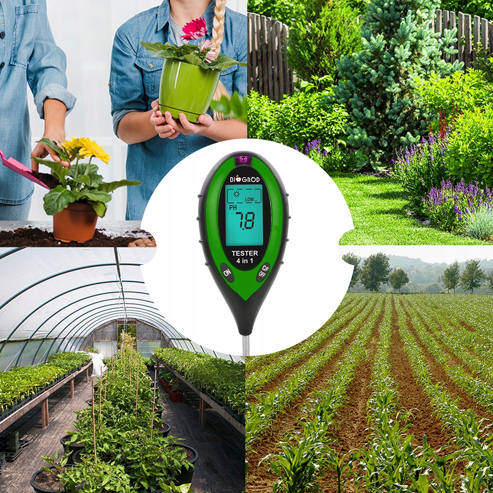 - Чотири функції - електронний тестер дозволить вам перевірити вимірювання pH (кислотності), вологості, температури та сонячного світла ґрунт як на ділянці, так і в домашньому саду, теплиці та на балконі!