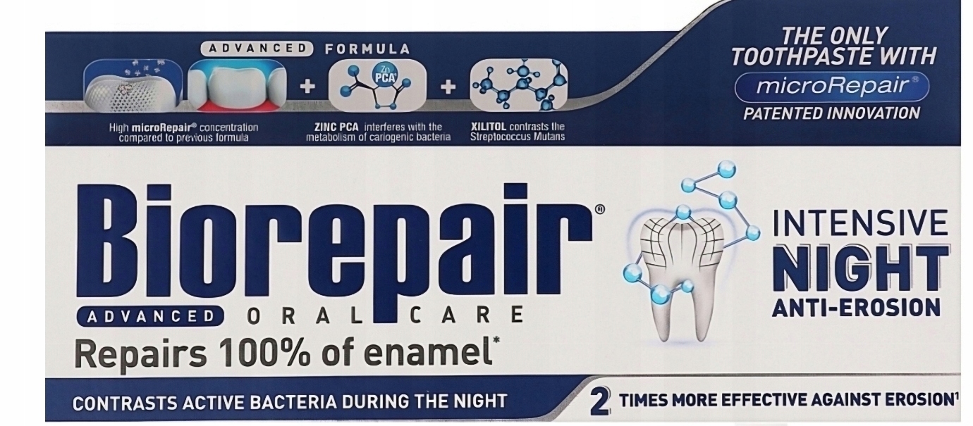 Удосконалену формулу зубної пасти було вдосконалено, щоб протидіяти демінералізації зубної емалі, яка відбувається вночі. MicroRepair® у високій концентрації осідає на емалі, відновлюючи її та захищаючи поверхню зуба від нічної ерозії. Цинк, PCA і ксиліт разом контрастують з агресивною діяльністю бактеріальних кислот, основною причиною демінералізації, нальоту, зубного каменю і карієсу. Крім того, особливий аромат стимулює нічне виділення слини, забезпечуючи природний захист емалі та свіже дихання після пробудження.
