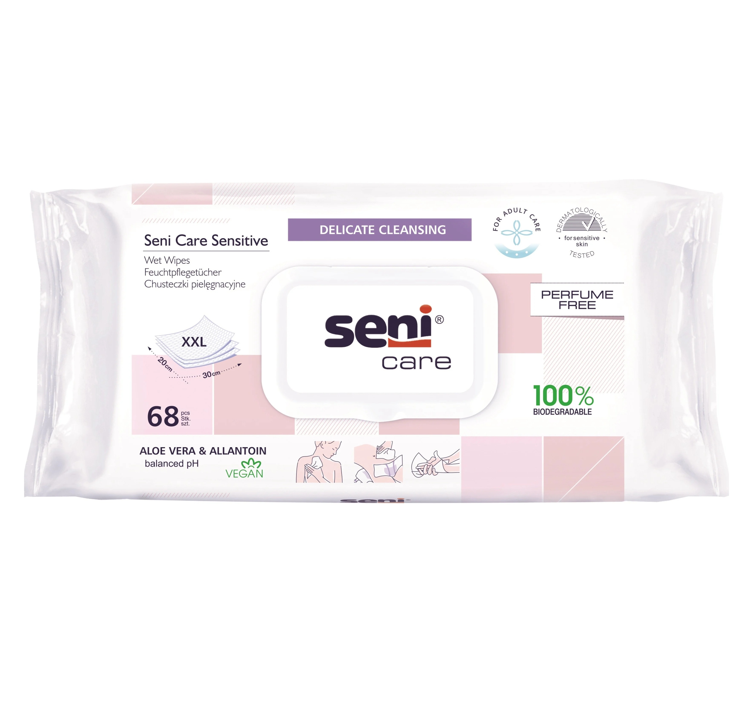 Вологі серветки Seni Care Sensitive виготовлені з м'якого нетканого матеріалу, який ніжно до шкіри. Завдяки великій поверхні 20 см х 30 см, вони дозволяють просто, швидко та економно підтримувати гігієну для дорослої людини.