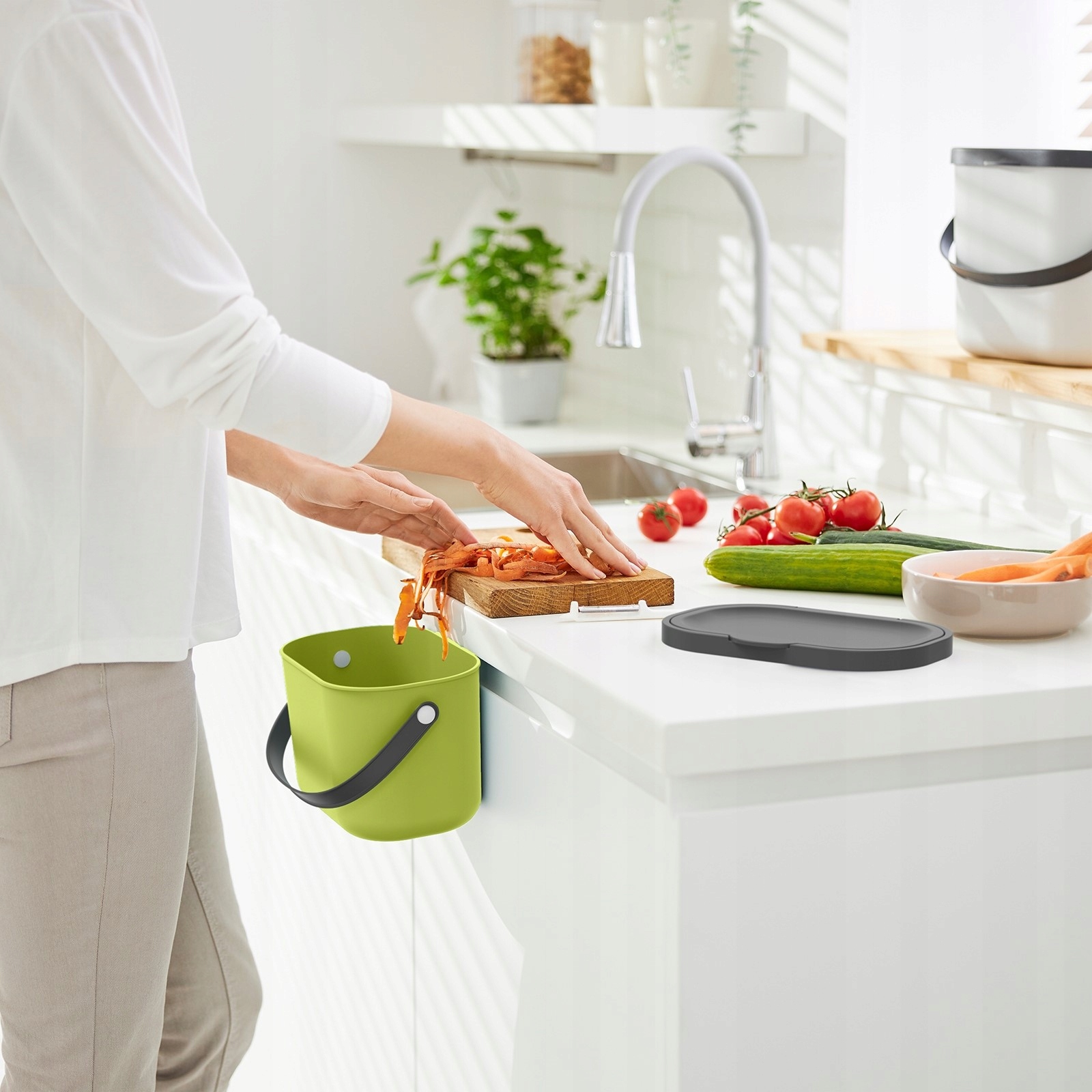 Відро — ідеальний кухонний допоміжний засіб для зручного та легкого збору органічних відходів, наприклад, кавових капсул або таблеток для миття посуду. Завдяки ідеальному компактному розміру його можна поставити на стільницю або повісити на двері та ящики на кухні за допомогою вбудованого підвісного кронштейна. Завдяки великому отвору ніщо не заважає легкій і чистій утилізації.
