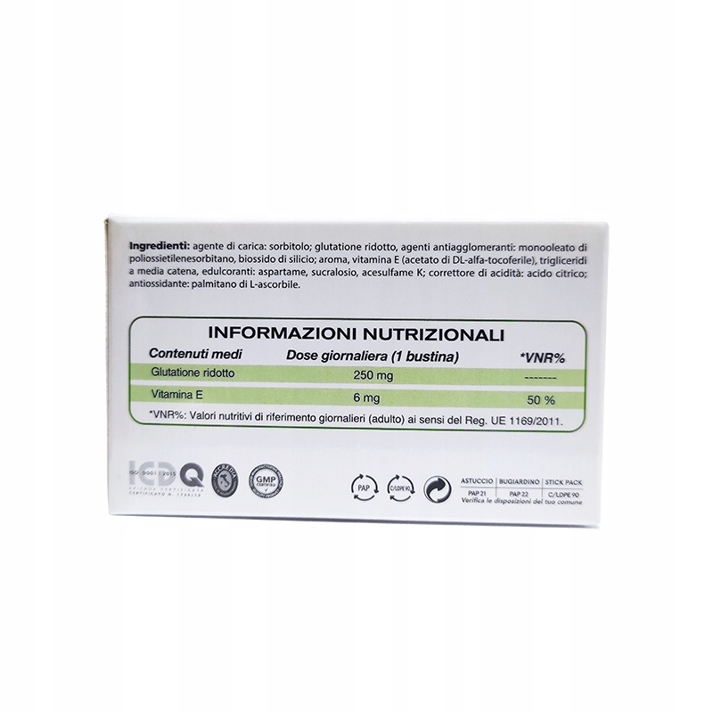 Інгредієнти б>: наповнювач: сорбіт; відновлений глутатіон; антизлежувачі: поліоксиетиленсорбітан моноолеат (полісорбат 80), діоксид кремнію; аромат; вітамін Е (dl-альфа-токоферилацетат); тригліцериди середнього ланцюга, підсолоджувачі: аспартам, сукралоза, ацесульфам К; регулятор кислотності: лимонна кислота; антиоксидант: L-аскорбілпальмітат.