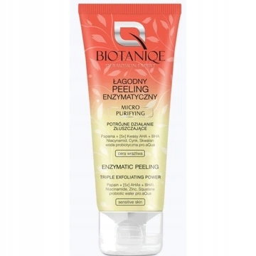 М'який ензимний пілінг Biotaniqe Micro Purifying з потрійним ефектом відлущування. Містить папаїн + [5x] AHA кислоти + BHA. Ніацинамід, цинк, сквалан і пробіотична вода pro.aQua. Підходить для чутливої шкіри.