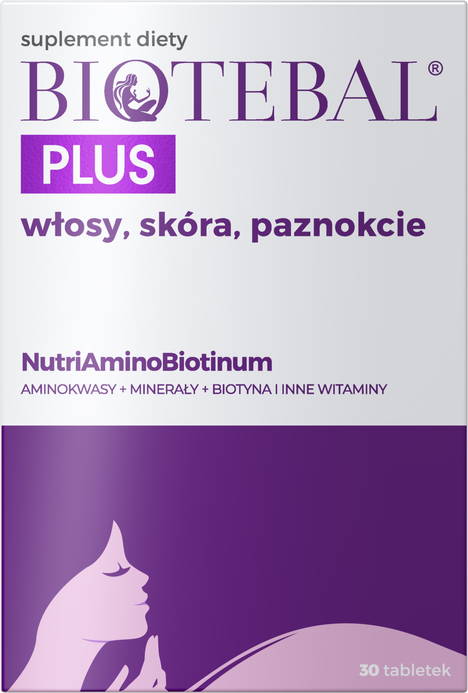 Біотебал ПЛЮС волосся, шкіра, нігті – дієтична добавка, рекомендована для щоденної підтримки стану та зовнішнього вигляду волосся, шкіри та нігтів. Він містить концентровану поживну формулу NutriAminoBiotinum, багату амінокислотами, мінералами та вітамінами, включаючи біотин. Biotebal PLUS волосся, шкіра, нігті містить максимальну кількість біотину, дозволену для використання в дієтичних добавках у Польщі (2500 мікрограмів у добовій порції).