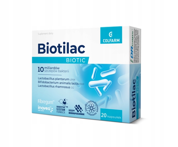 Біотична дієтична добавка Biotilac - це пробіотична препарат, що містить 10 мільярдів живих бактеріальних культур трьох бактеріальних штамів, а також фібрегум ™ та Invea ™ - розчинного волокна з акації. Бактеріальні штами зберігають свої корисні властивості, завдяки мікрокапсулам, що захищають. Капсули забезпечують вивільнення бактерій у малому та товстій кишці, що сприяє колонізації цільового сегмента травної системи. День. доповнити звичайну дієту. Дієтична добавка не має цілющих властивостей.