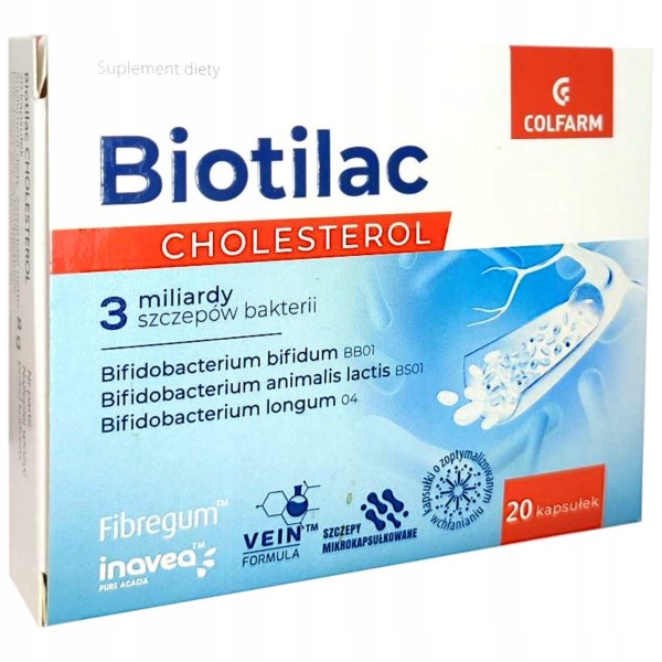 холестерин біотілаку, який включає 3 мільярди жвавих бактеріальних культур трьох відібраних бактеріальних сил, а також акації.