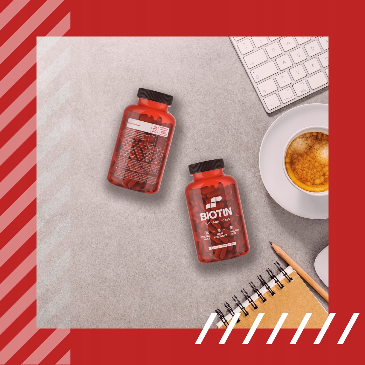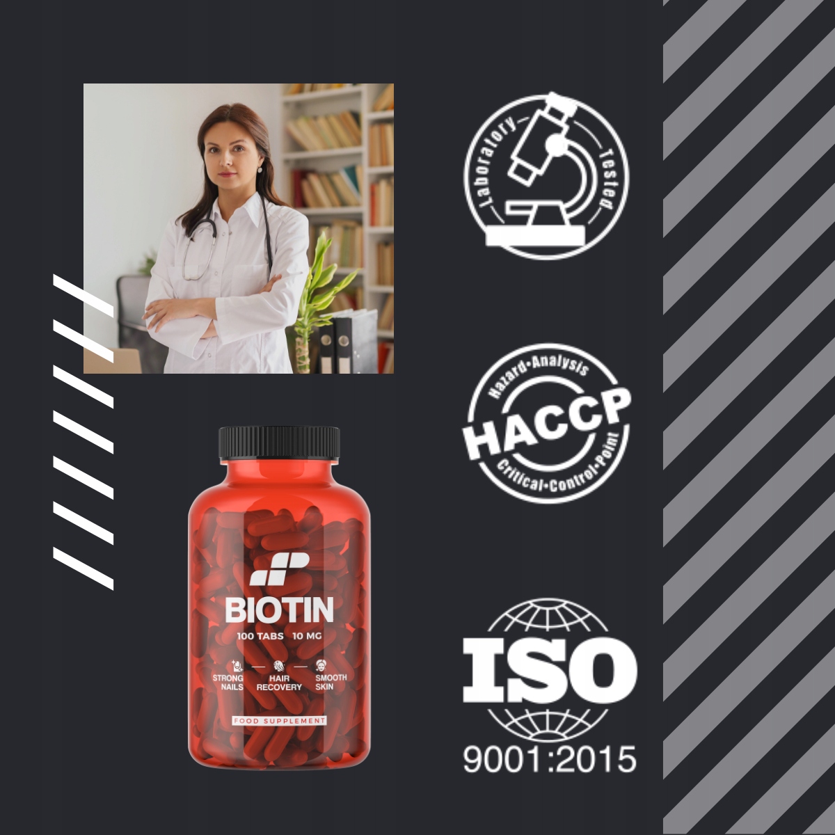 Здорова шкіра, міцне волосся та нігті — це одне, але справжня підтримка починається зсередини. Інгредієнти біотину, такі як цинк, вітаміни B1, B6, B12 і селен, позитивно впливають на ваші метаболічні функції, життєвий тонус і стан нервової системи. Це стосується не тільки краси, але й хорошого самопочуття та здоров'я. У суєті повсякденного життя вам потрібна підтримка, яка змусить вас почуватися сяючим. Завдяки біотину від MP Sport ви дбаєте про себе найкращим чином. Крім того, відповідність найвищим стандартам якості підтверджується сертифікатами ISO та HACCP, що надає Вам впевненості та довіри до продукту. Вибір Біотину від MP Sport — гарантія комплексного догляду за Вашою красою. Щодня дивуйтеся своєму сяйву!