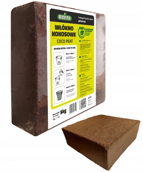 Натуральне кокосове волокно BIOVITA COCO PEAT у вигляді пресованого брикету, призначене для поліпшення структури субстрату та вирощування рослин в домашніх умовах, саду та теплиці. Після зволоження брикет збільшує свій об'єм приблизно до 63 літрів, створюючи легкий, добре аерований субстрат.