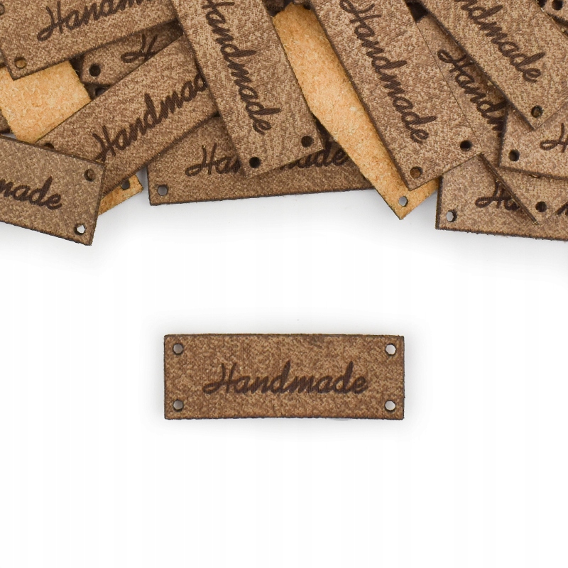 Бирка з написом "Handmade" і чотирма отворами для шиття.