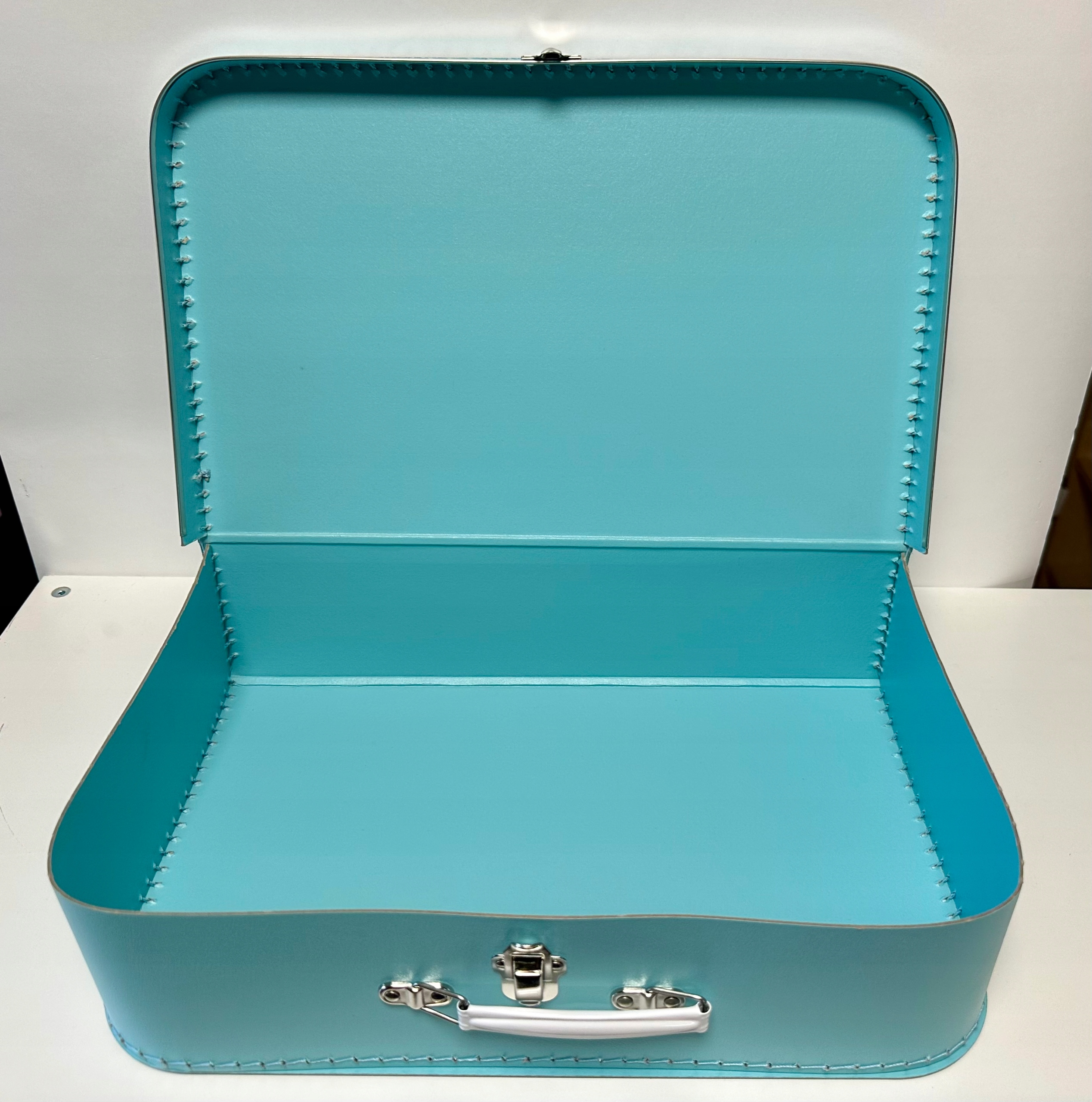 валізи в бірюзовій валізі, кінець покритий декоративним металевим краєм.