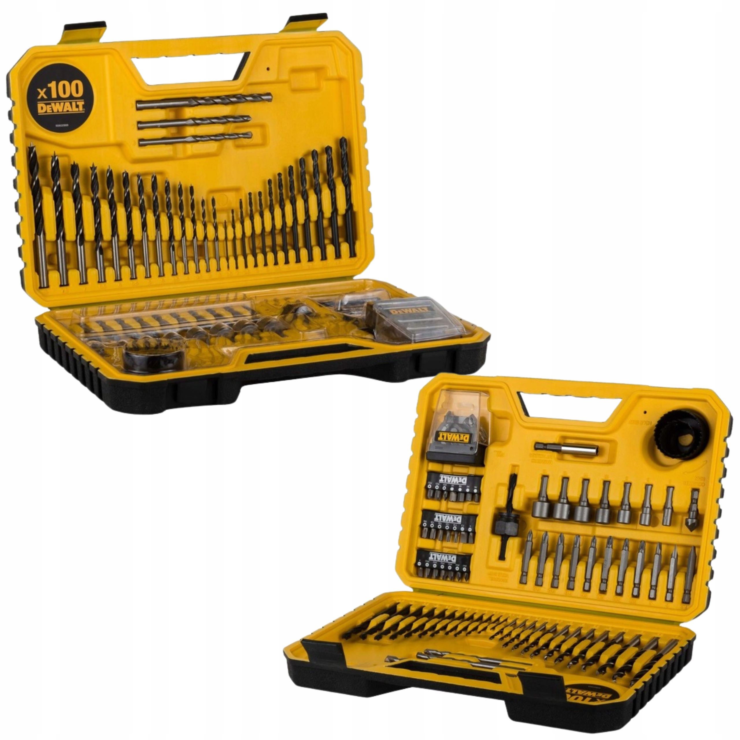 , що містить аж 100 елементів Набір Dewalt включає широкий спектр свердла та бітів, що дозволяє працювати в різних матеріалах .