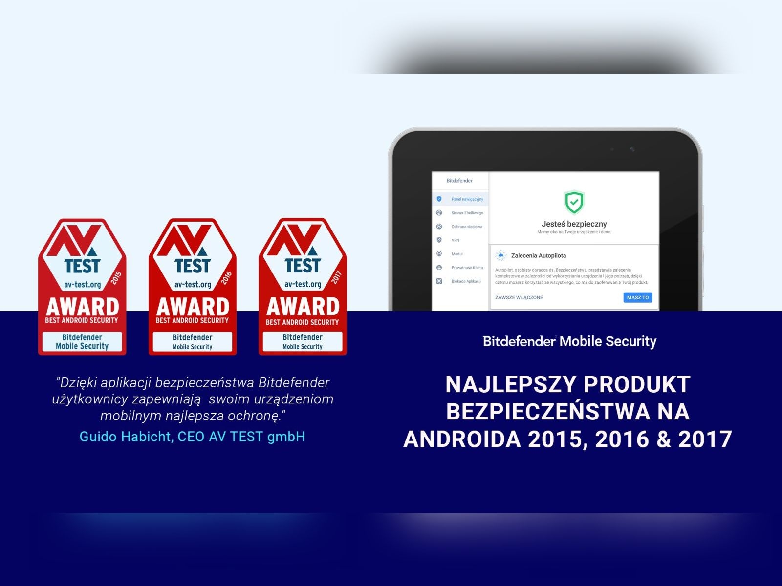 Антивірус Bitdefender Mobile Security – визнаний AV-TEST найкращим продуктом безпеки для Android у 2020, 2017 роках, 2016 і 2015 r.