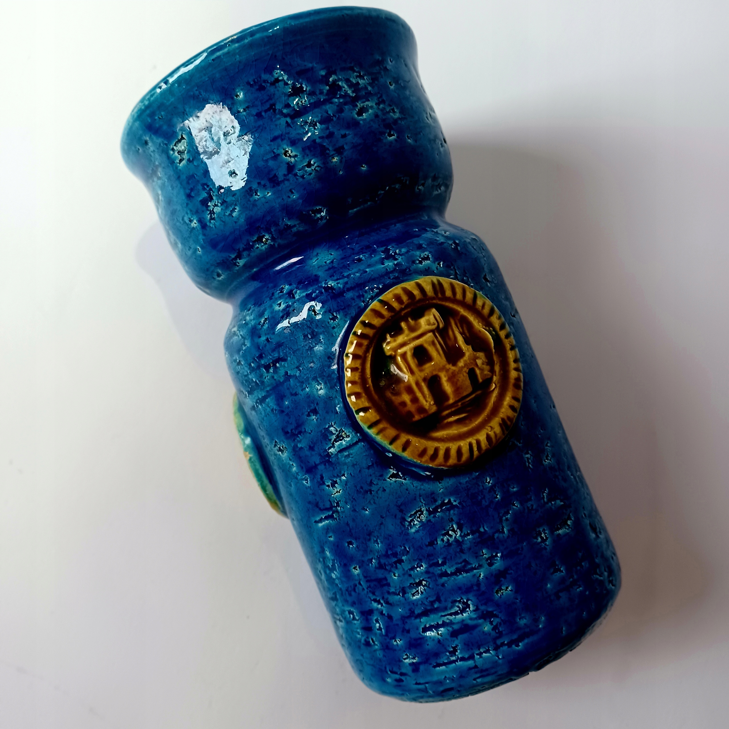 Блакитний, бірюзовий, чорно-меланжевий кольори та медальйони-декори бежевого та коричневого кольорів, що імітують фрагменти укріплень замку.Ваза не схожа на всі інші, але така ж красива, як і все, зроблене дизайнером - ALDO LONDI.Дуже добре хвороба! Розміри: висота - 14,5 см, ширина 7,5 см. РЕКОМЕНДУЮ!!