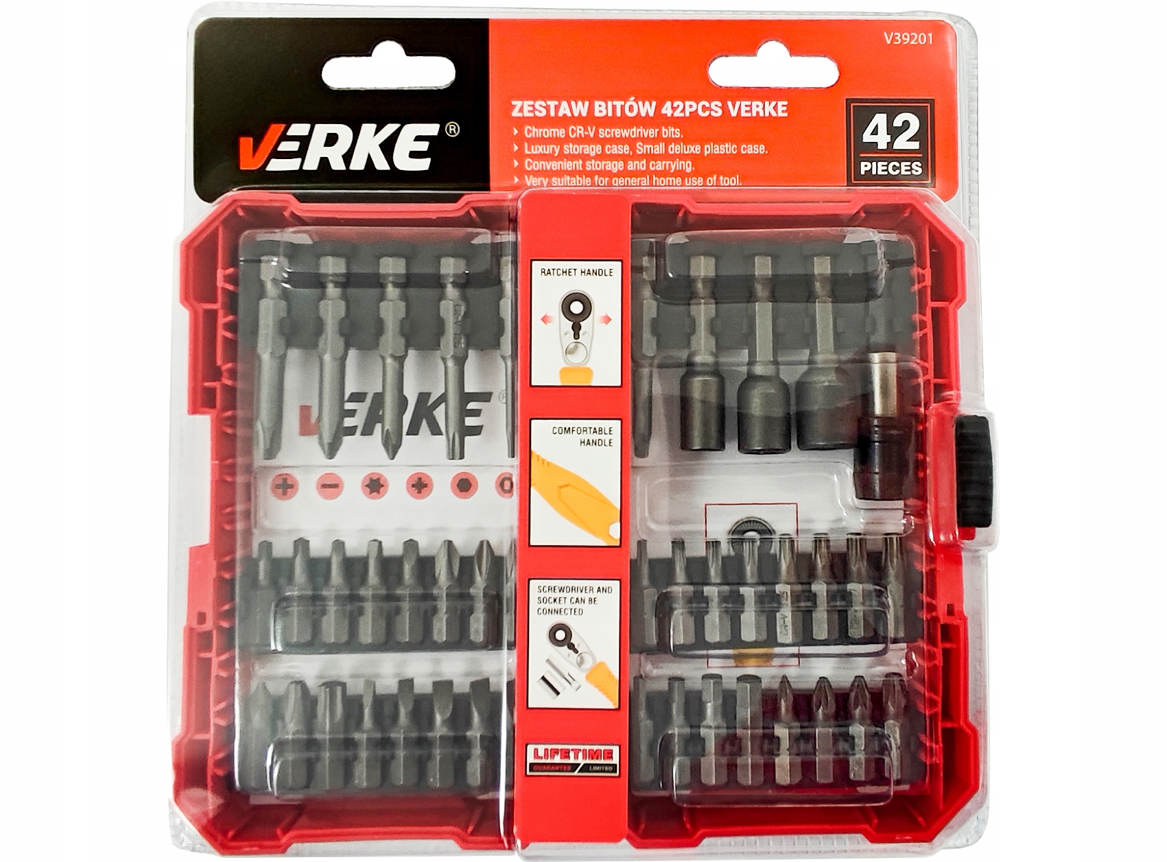 Біти Verke - це набір професійних аксесуарів, який складається з 42 елементів. 41 насадка довжиною 25 і 50 мм виготовлена з хромованадієвої сталі (CR-V). Магнітний швидкозмінний тримач полегшує заміну біт. Усі елементи зібрані в практичну, міцну коробку для зручного зберігання та транспортування.