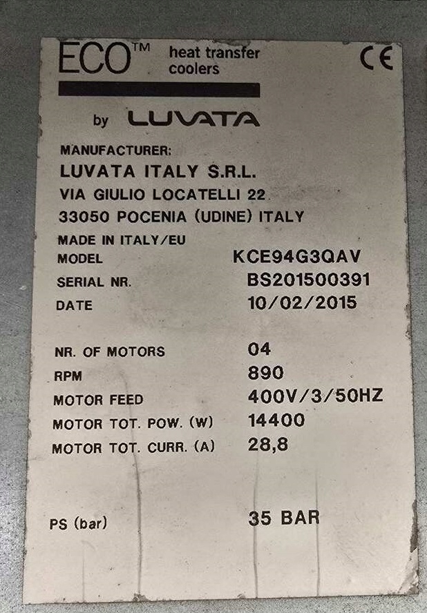 - Вентилятори: 4x 910 мм , 400V живлення, поворот 890/700 rpm/min, потужність 3,6/2.5 kw живлення: