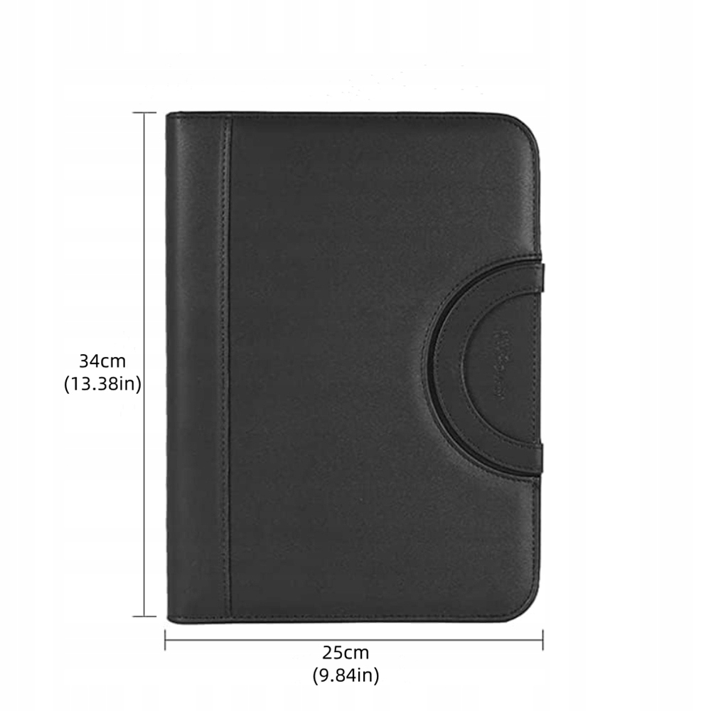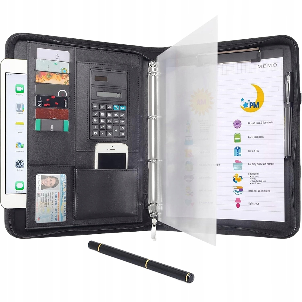 ❤️【Місткий органайзер для конференцій】Чорний органайзер зі складною ручкою, виготовлений із зовнішнього шару PU шкіри, водонепроникний і легко чиститься. Включає блокнот на 25 аркушів, калькулятор, ручку, 4 кільця для палітурки, 9 слотів для карток і 10 прозорих чохлів. Застібка-блискавка з боковою кишенею. 📁✨