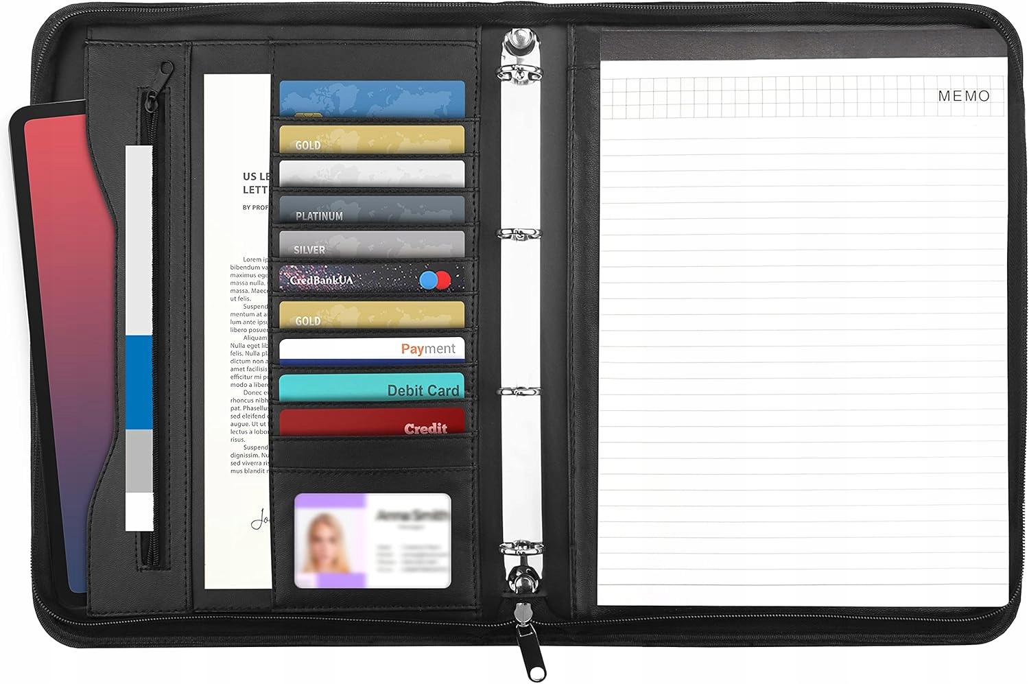 Всередині портфеля є в'яжучий з чотирма кліпами, що дозволяє організовувати важливі нотатки та документи в пластикових портфелях. Весь закінчений у стилі Padfolio від імітації шкіри в елегантному, чорному кольорі та захищеному блискавці, що гарантує безпеку вмісту.