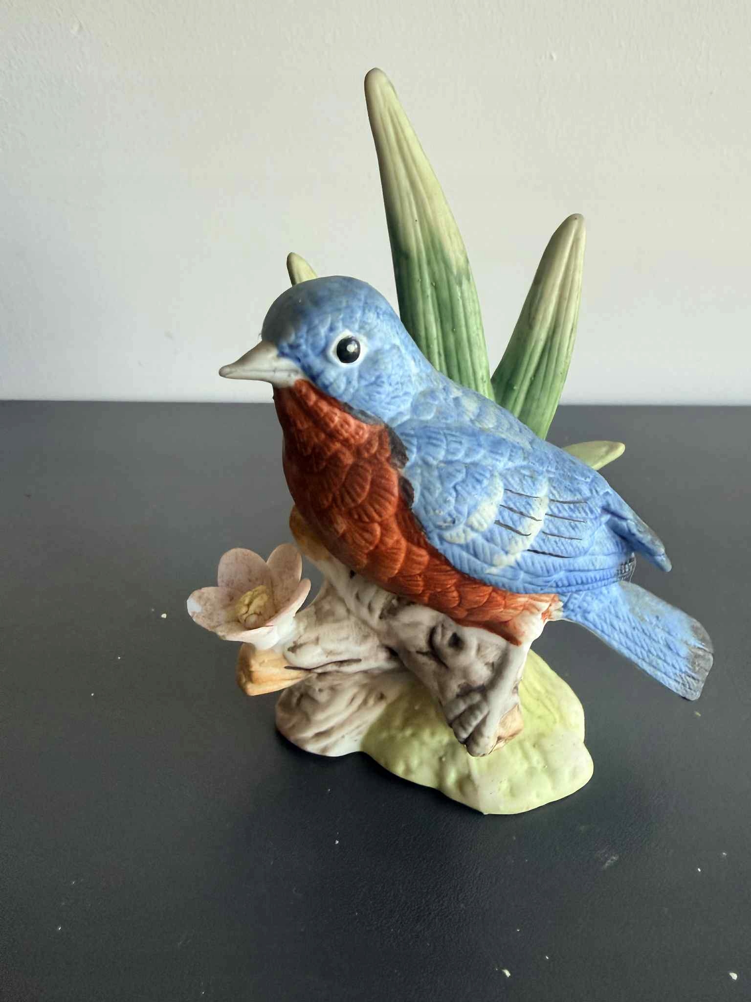 Błękitnik – porcelanowa figurka ptaka z kwiatem, ręcznie malowana