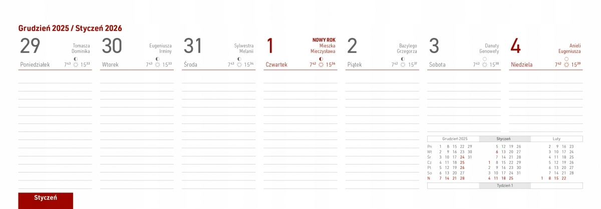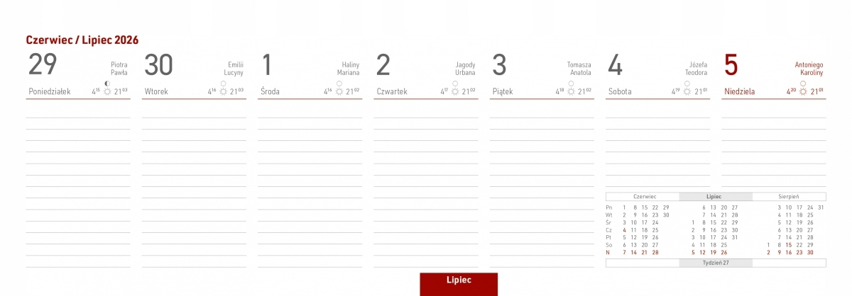 З місцем для записів на кожен день. Позначено іменини, свята, світанки та заходи сонця та фази Місяця.