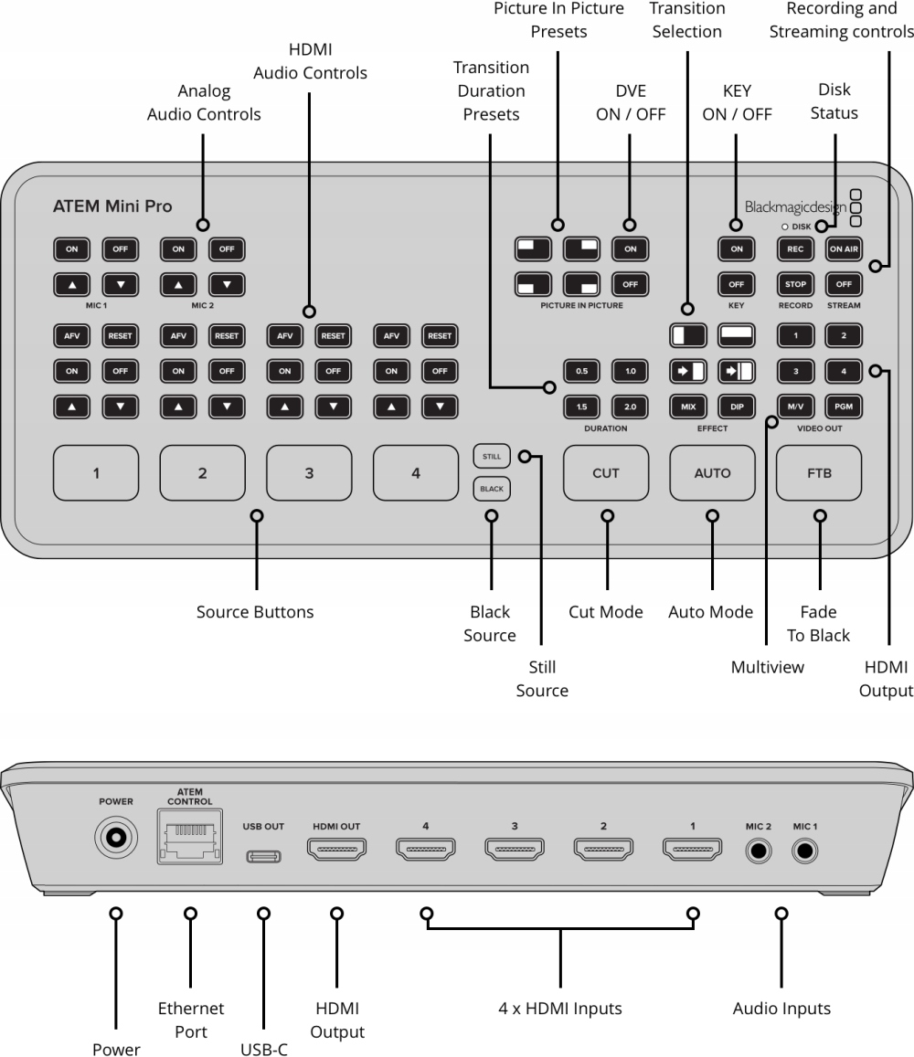 ATEM Mini Pro швидко налаштовується та простий у використанні. Включає 4 стандартизовані конвертовані входи HDMI, вихід USB для веб-камери, вихід HDMI, аудіомікшер Fairlight з еквалайзером і динамікою, DVE для «картинки в картинці», ефекти переходу, кольоровість зеленого екрана, 20 фотографій для заголовків і безкоштовне програмне забезпечення ATEM Control. ATEM Mini Pro також дозволяє здійснювати прямий запис на флеш-накопичувач USB у форматі H.264 і пряме потокове передавання через Ethernet на YouTube Live і багато іншого. Multiview для 4 камер також доступний із такими функціями: медіа, попередній перегляд і програма, а також статус запису, потокове передавання та аудіо.