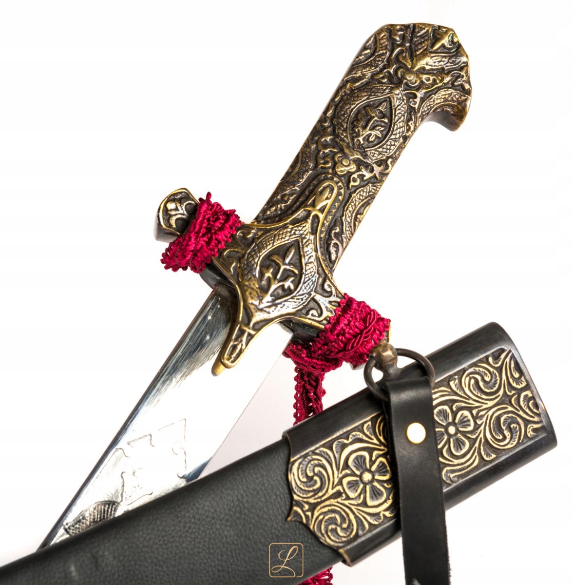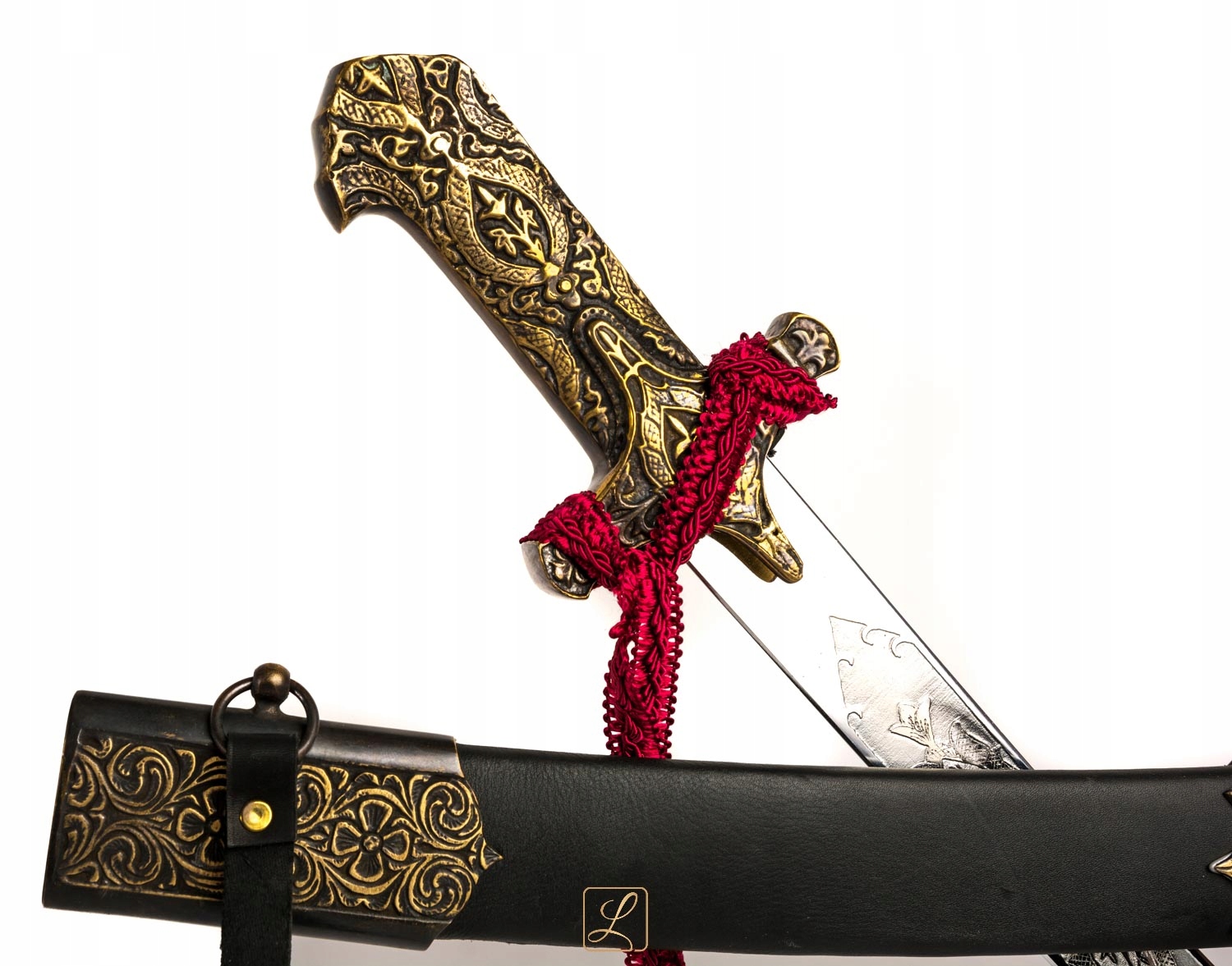 Красива карабела благородна вірменська з 18 століття, з піхвою, хромованим лезом, укомплектованим з висячим дерев’яним табло. Ручка та латунна арматура в оливковому патині. Представлений набір - це робота польських майстрів.
