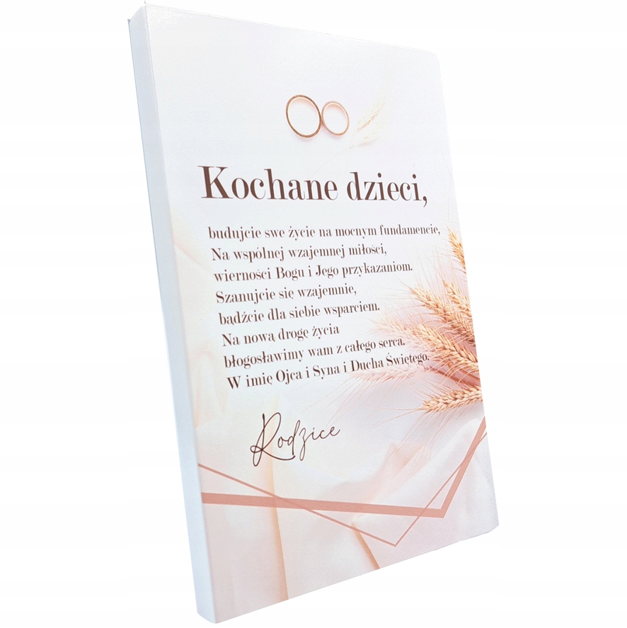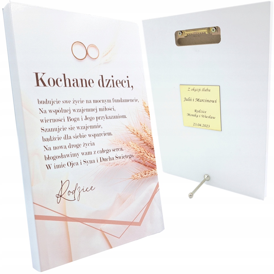 Ілюстрація з традиційним текстом благословення, яке дають батьки нареченому і нареченій. Унікальний весільний сувенір з вигравіруваною присвятою.