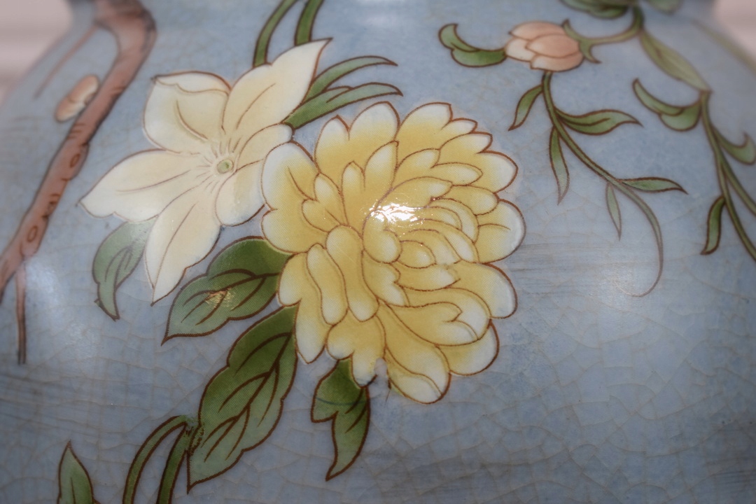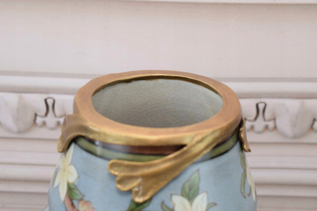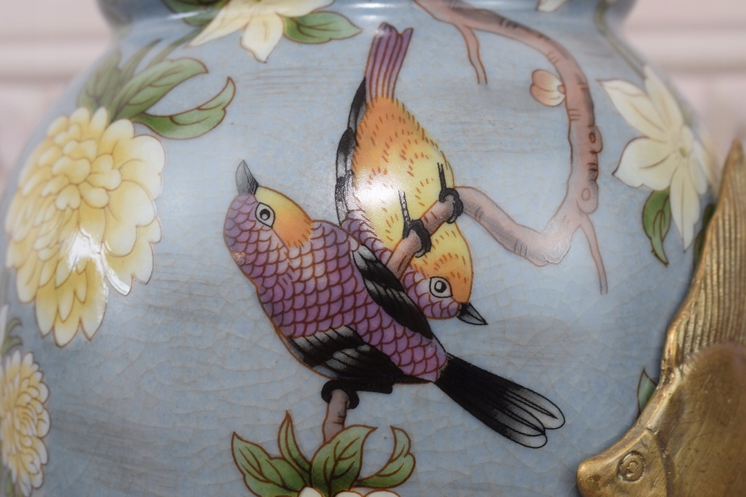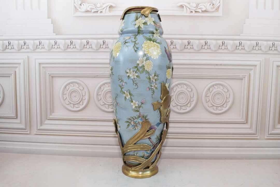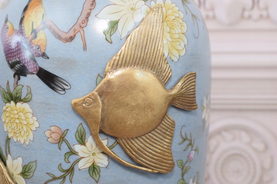Блакитна музейна ваза Ваза-амфора - фарфор + бронза - риба квіти
