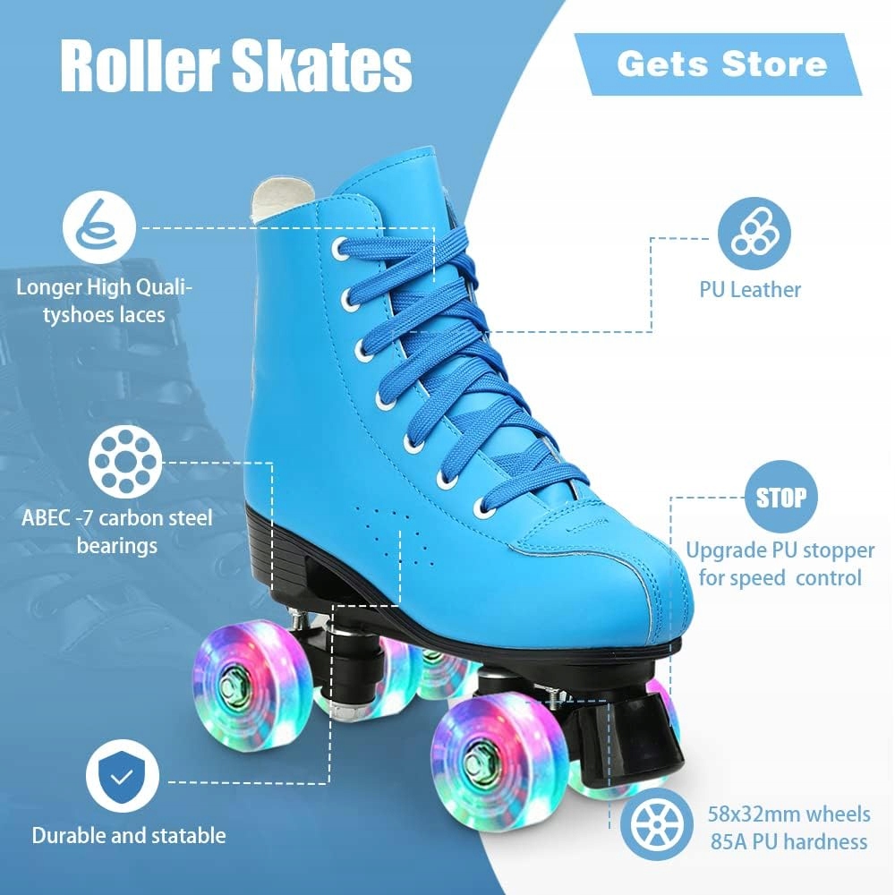 Роликові ковзани з поліуретану шкіри, жіночі роликові ковзани на відкритому повітрі та в приміщенні, регульовані чотириколісні роликові ковзани, преміум для жінок, чоловіків, хлопчиків і дівчат, синього кольору зі світлодіодними колесами