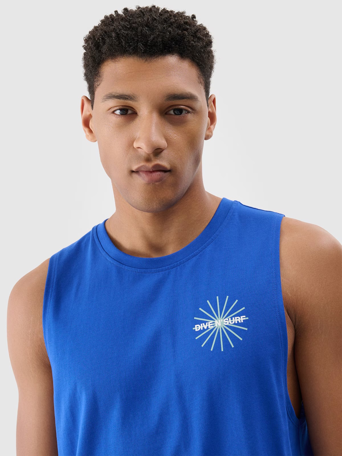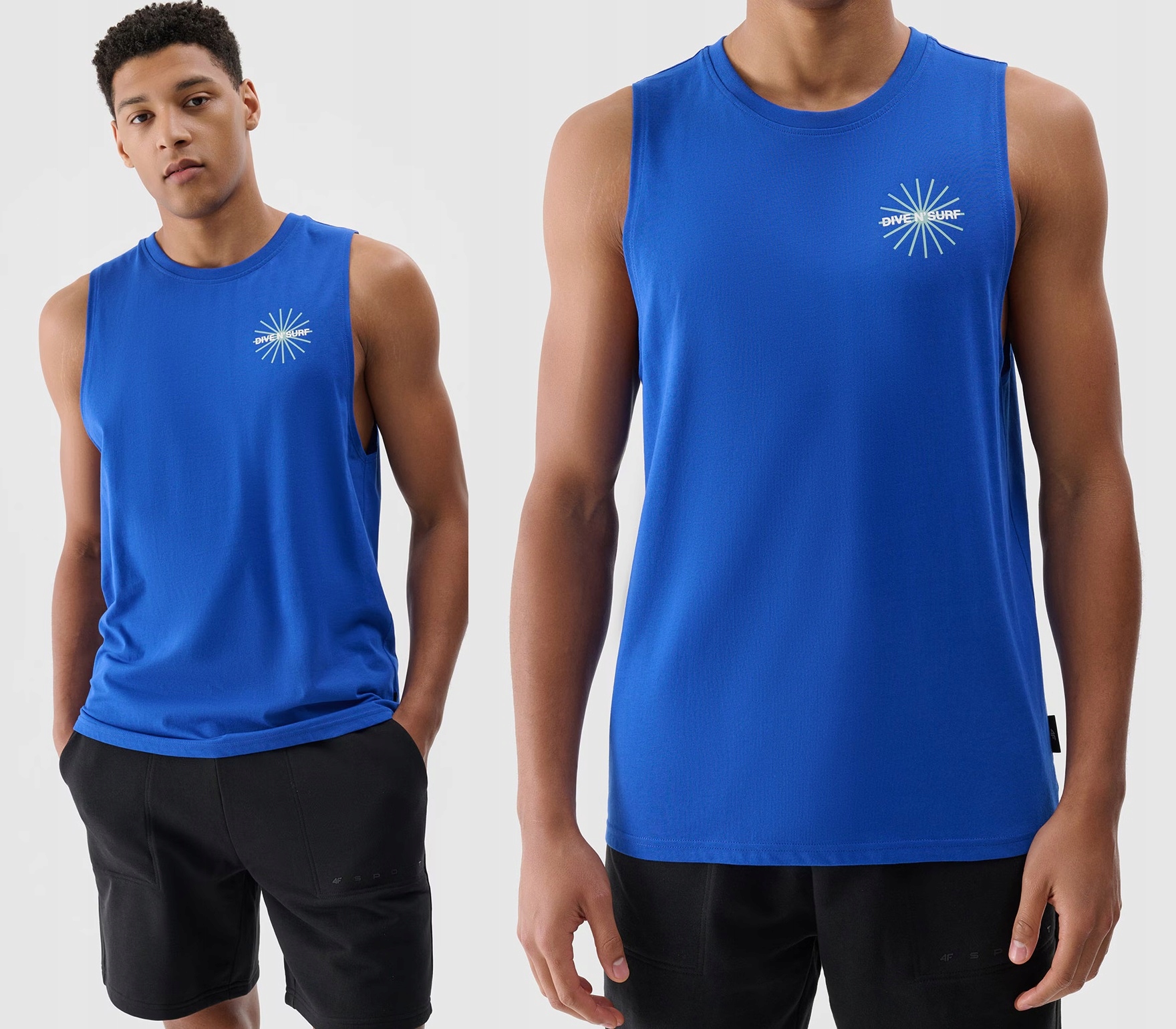 чоловіча сорочка без рукавів завдяки вазі 180 GSM м'яка на дотик і добре йде. Він не живе і забезпечує довговічність і зручність при носінні року. 4 Кругле декольте закінчене легким ребром. Друк "Dive N'Surf" видно спереду. Широкі дірки для плечей.