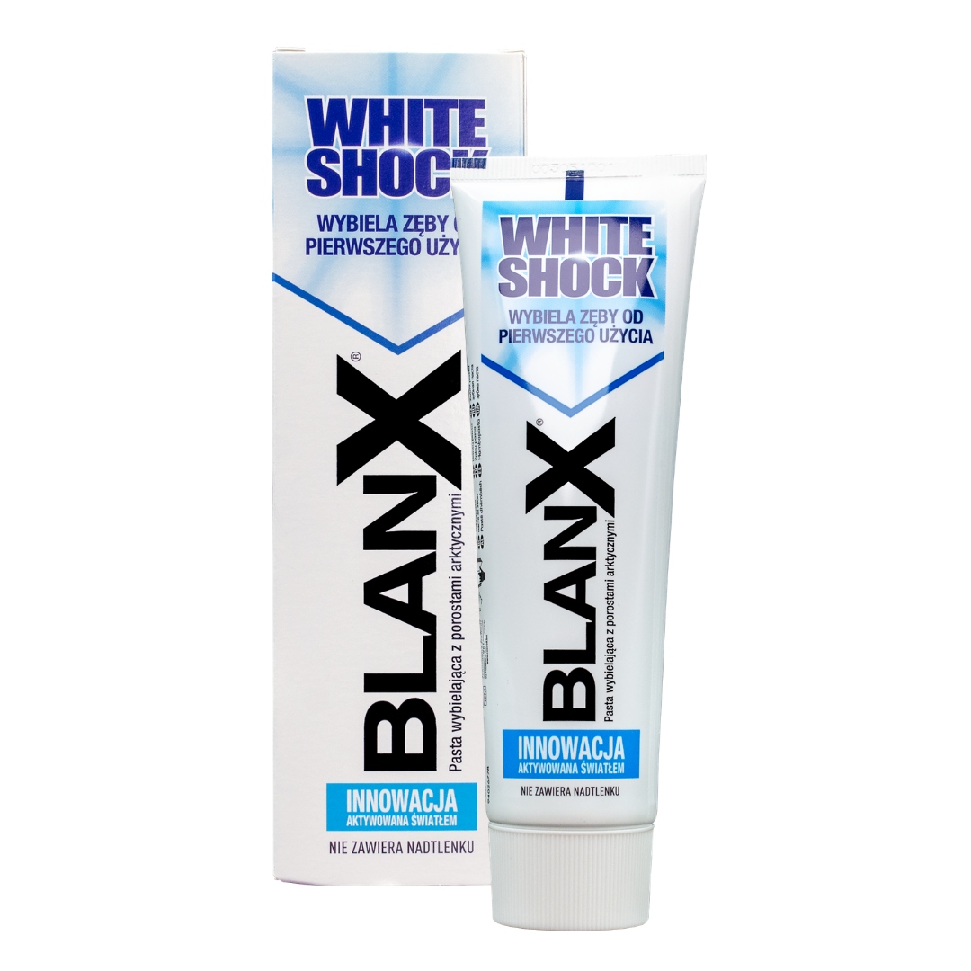 - Формула BlanX White Shock природним чином відбілює без використання оптичних відбілювачів і безпечна для ясен, оскільки не містить перекису.