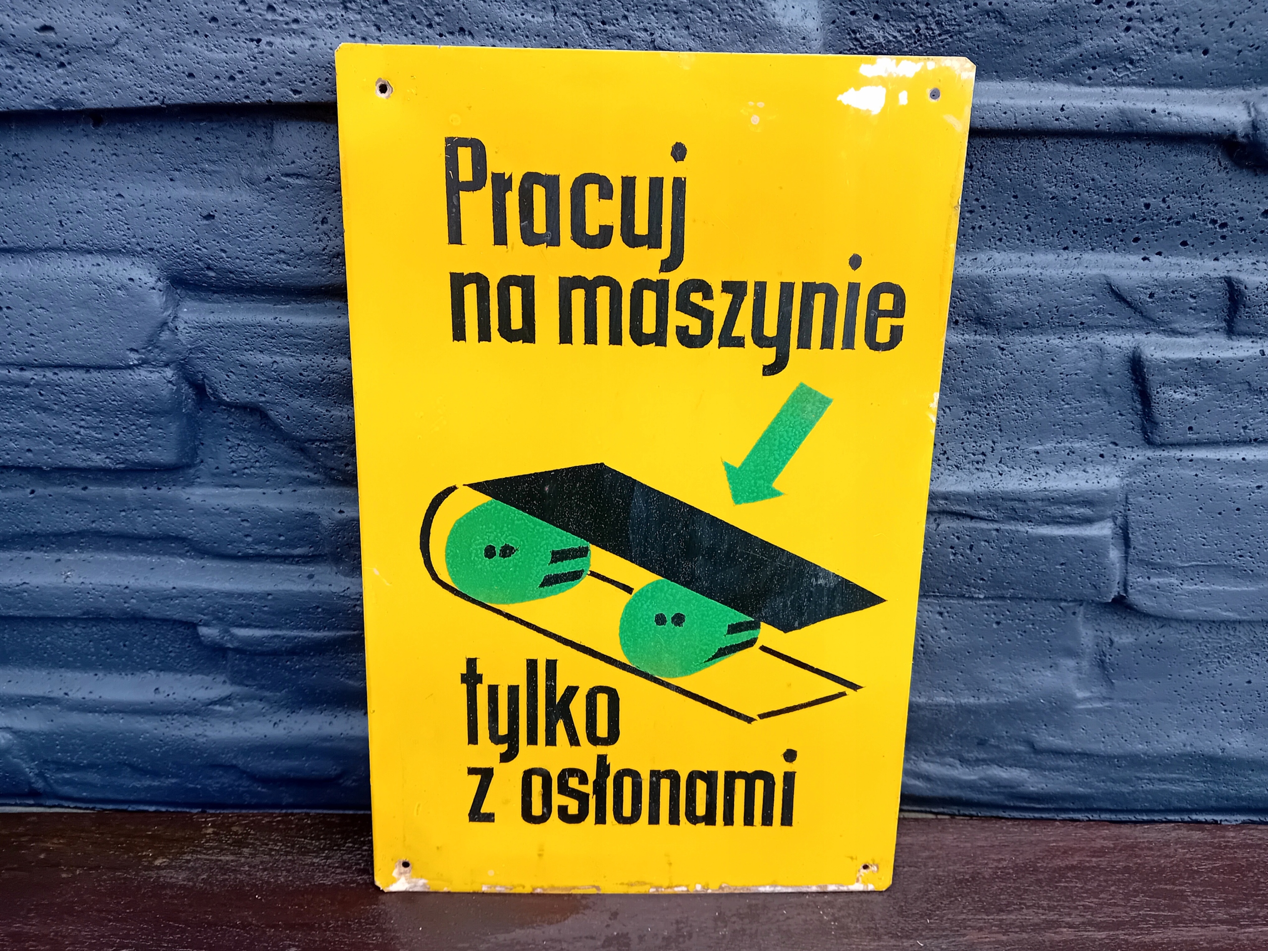 BLASZANA TABLICA PRL - PRACUJ NA MASZYNIE TYLKO Z OSŁONAMI