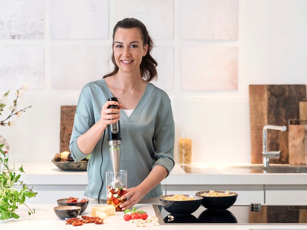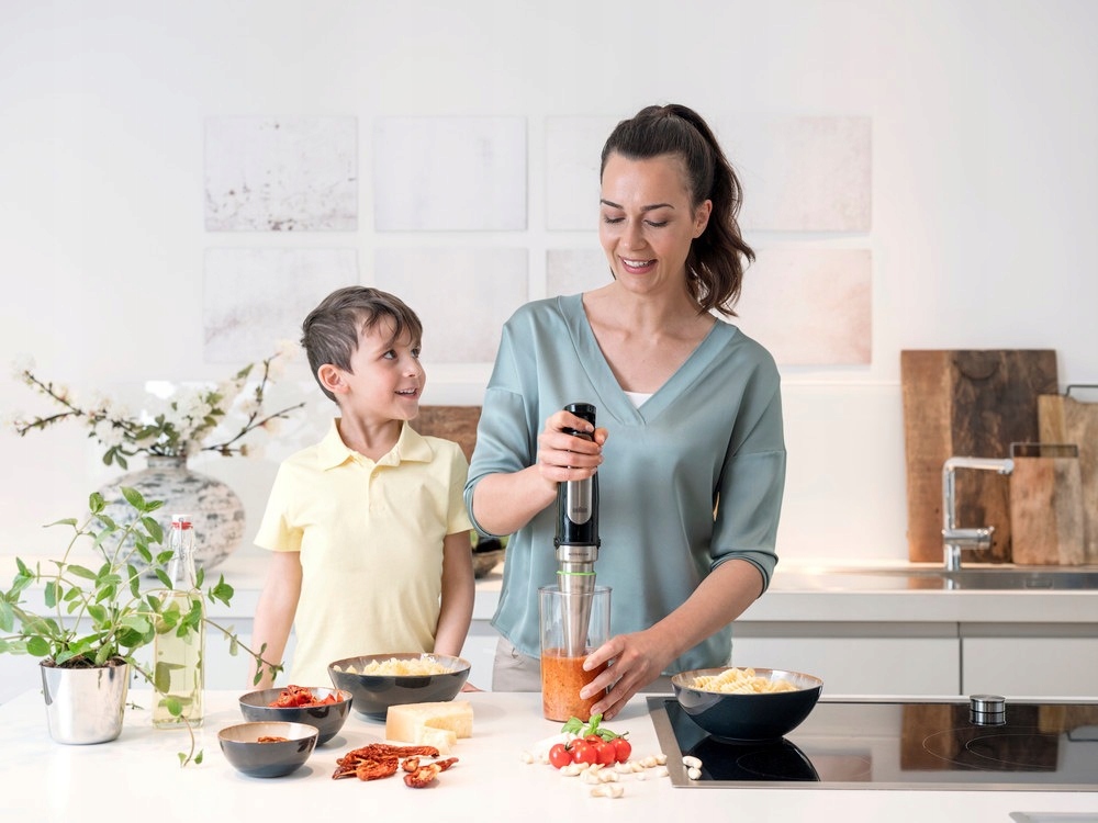 Ефективний MultiQuick 7X оснащений потужним двигуном 1000 Вт. Завдяки йому ви можете легко готувати шовковисті соуси, овочеві крем-супи, салати, тістечка, фруктові смузі, муси, пюре, пасти, заправки та багато інших смачних варіантів . Відкрийте для себе нові можливості для кулінарних творінь!