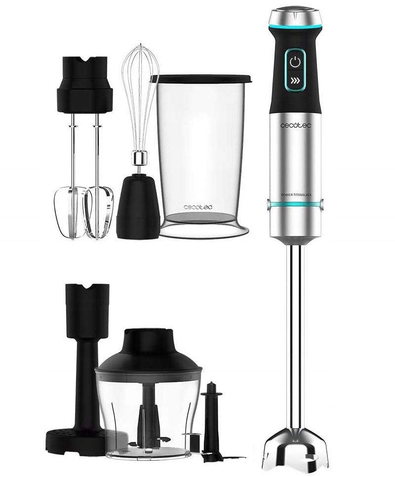 В комплекті Cecotec Power TitanBlack 1200 Блендер XL PerfectCream & Crush містить резервуар з кришкою ємністю 800 мл, наконечник для змішування, наконечник віночка, гачки для змішування, подрібнювач ємністю 600 мл і наконечник для пюре.