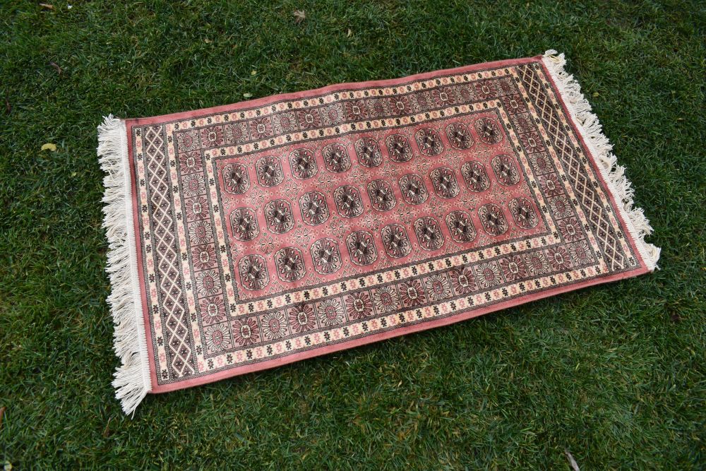 На наступному аукціоні я пропоную вам цікавий, виготовлений зі штучного шовку - віскози - машинного виробництва, килим/підвіска з пакистанським дизайном.