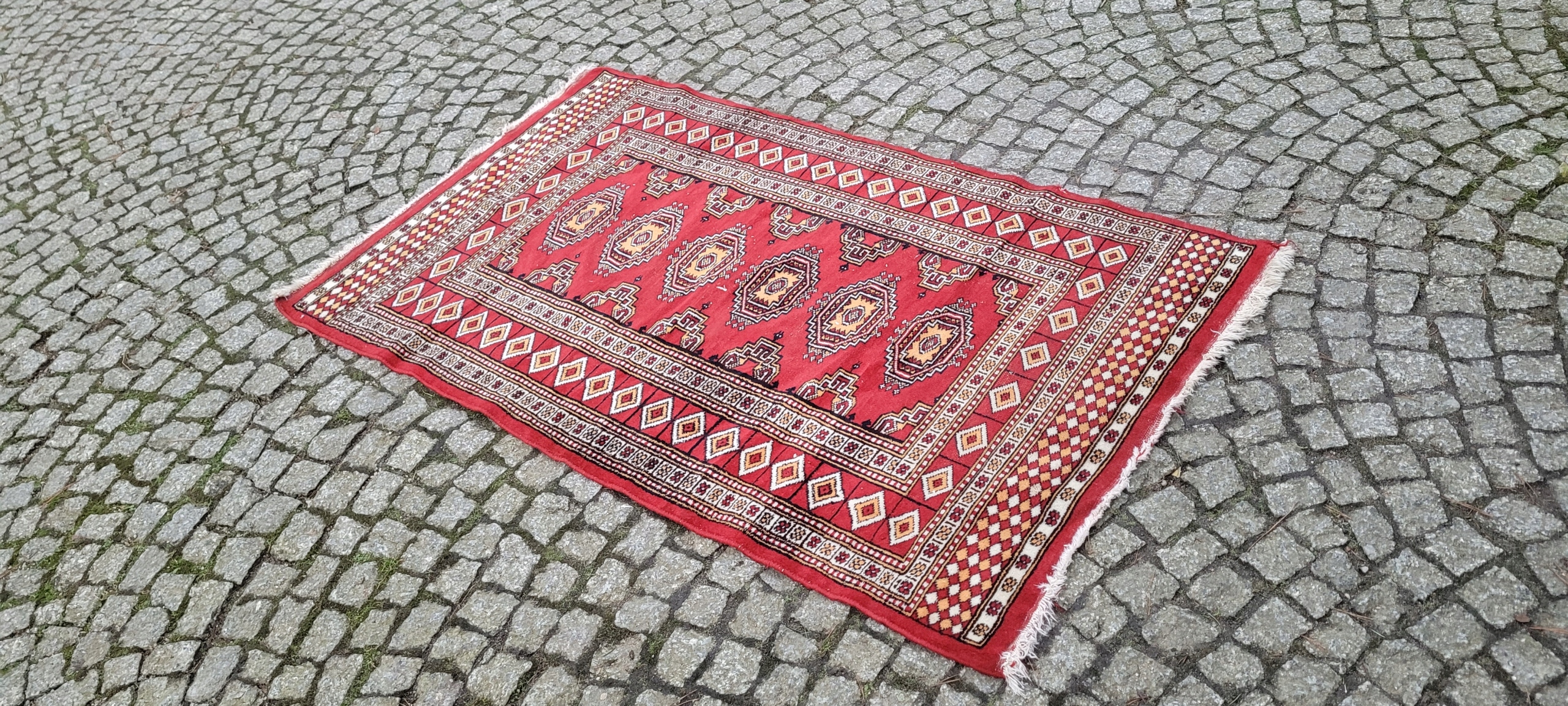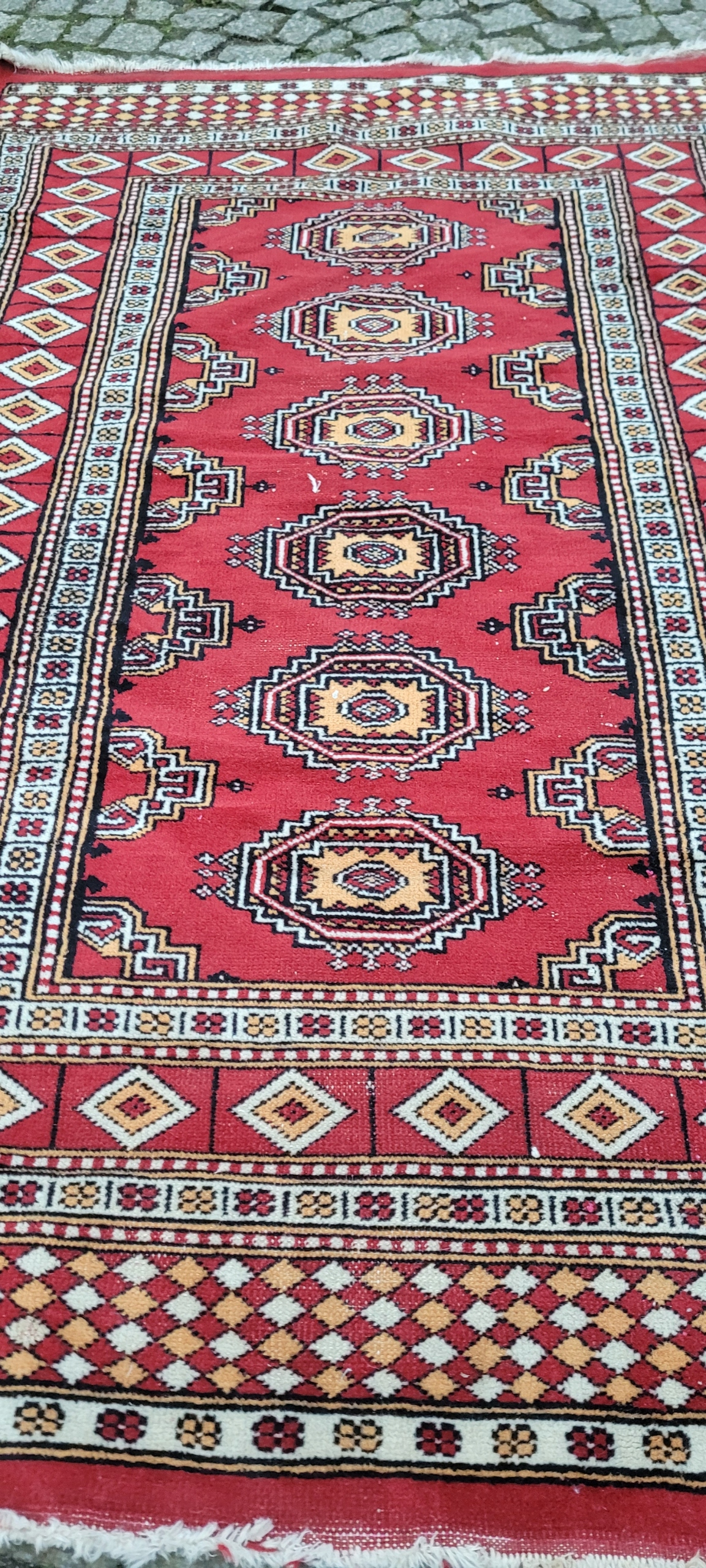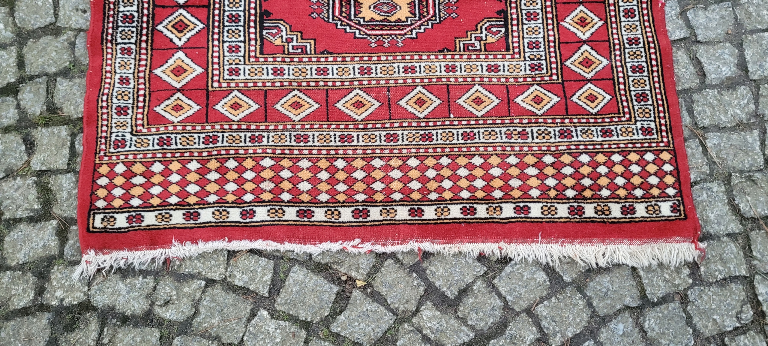 Бухарський килим. Виткана вручну з полірованої вовни найвищої якості. Характеризується компактним, приємним на дотик, блискучим флісом і красивими кольорами та візерунками. В хорошому стані, видно на фото.