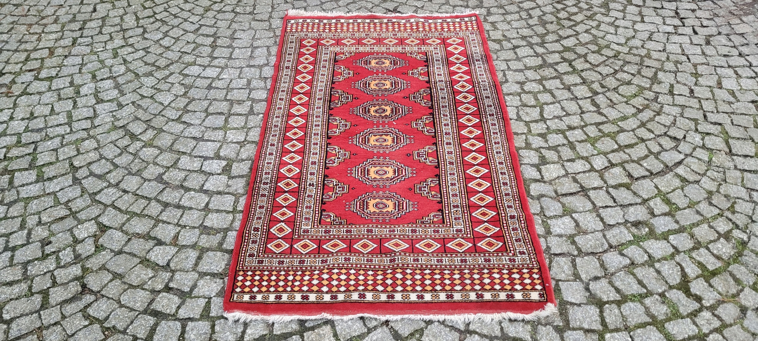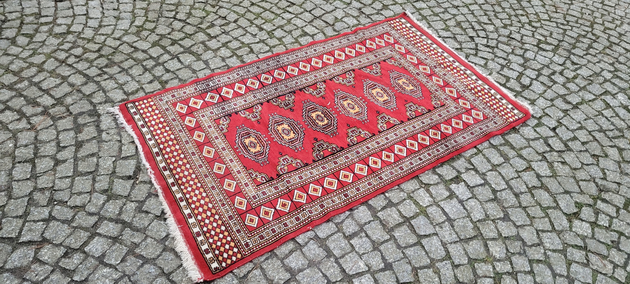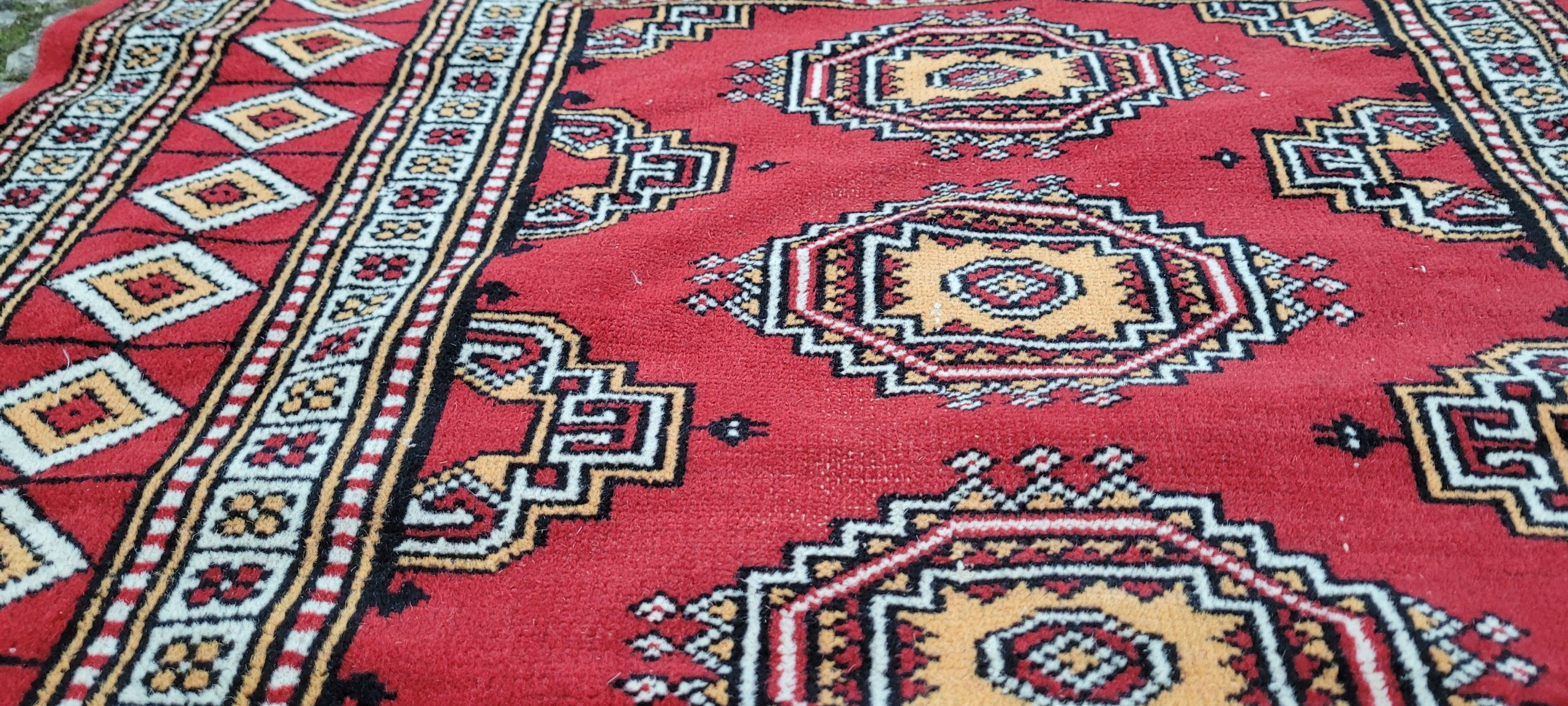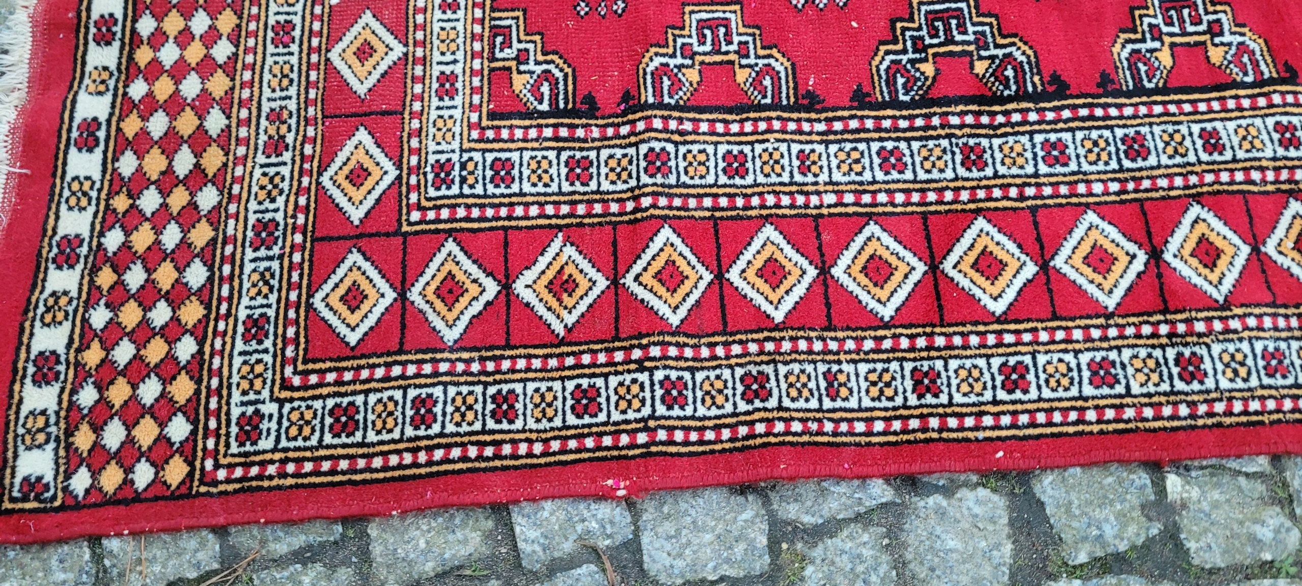 Бухарський килим. Виткана вручну з полірованої вовни найвищої якості. Характеризується компактним, приємним на дотик, блискучим флісом і красивими кольорами та візерунками. В хорошому стані, видно на фото.