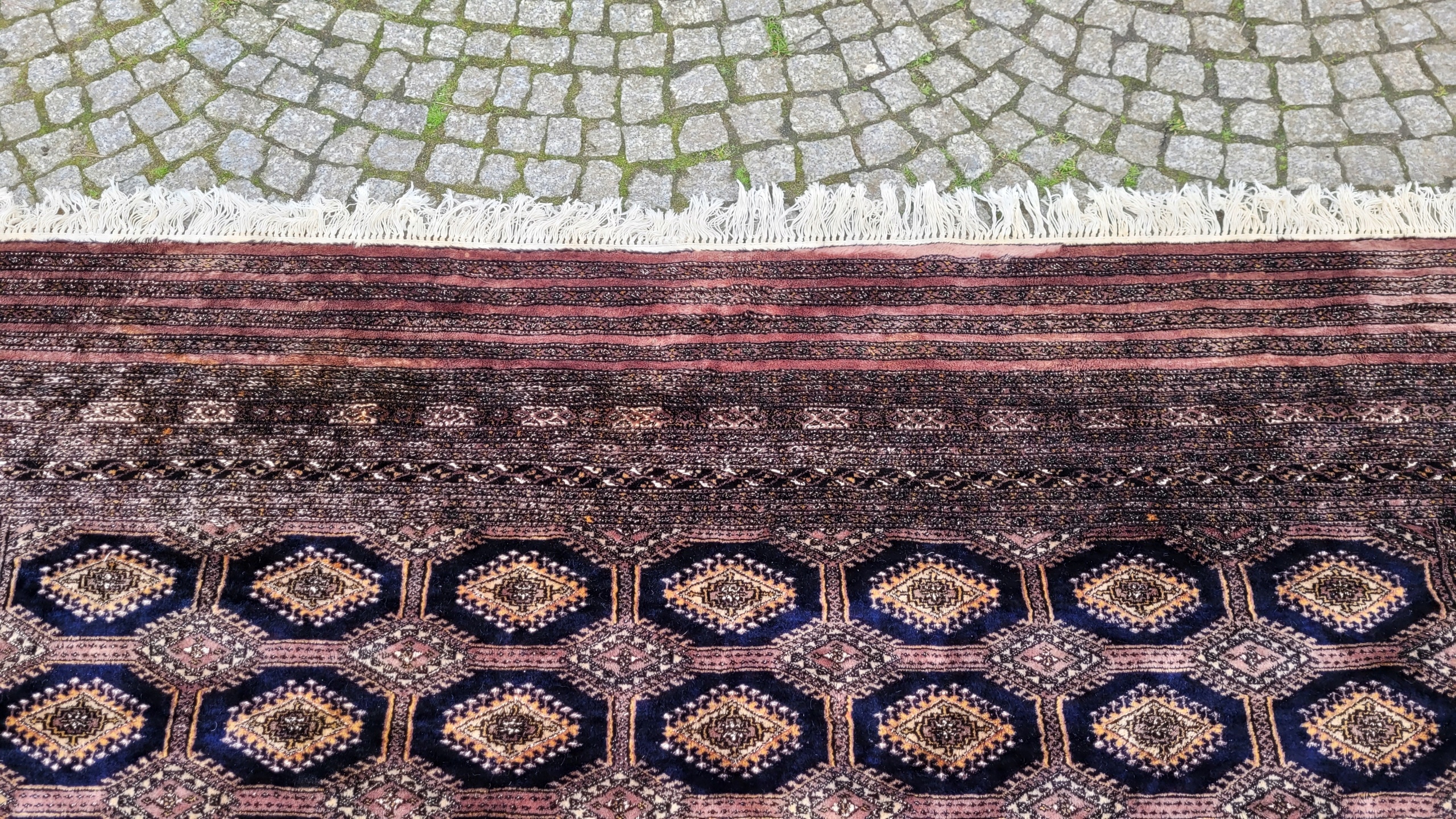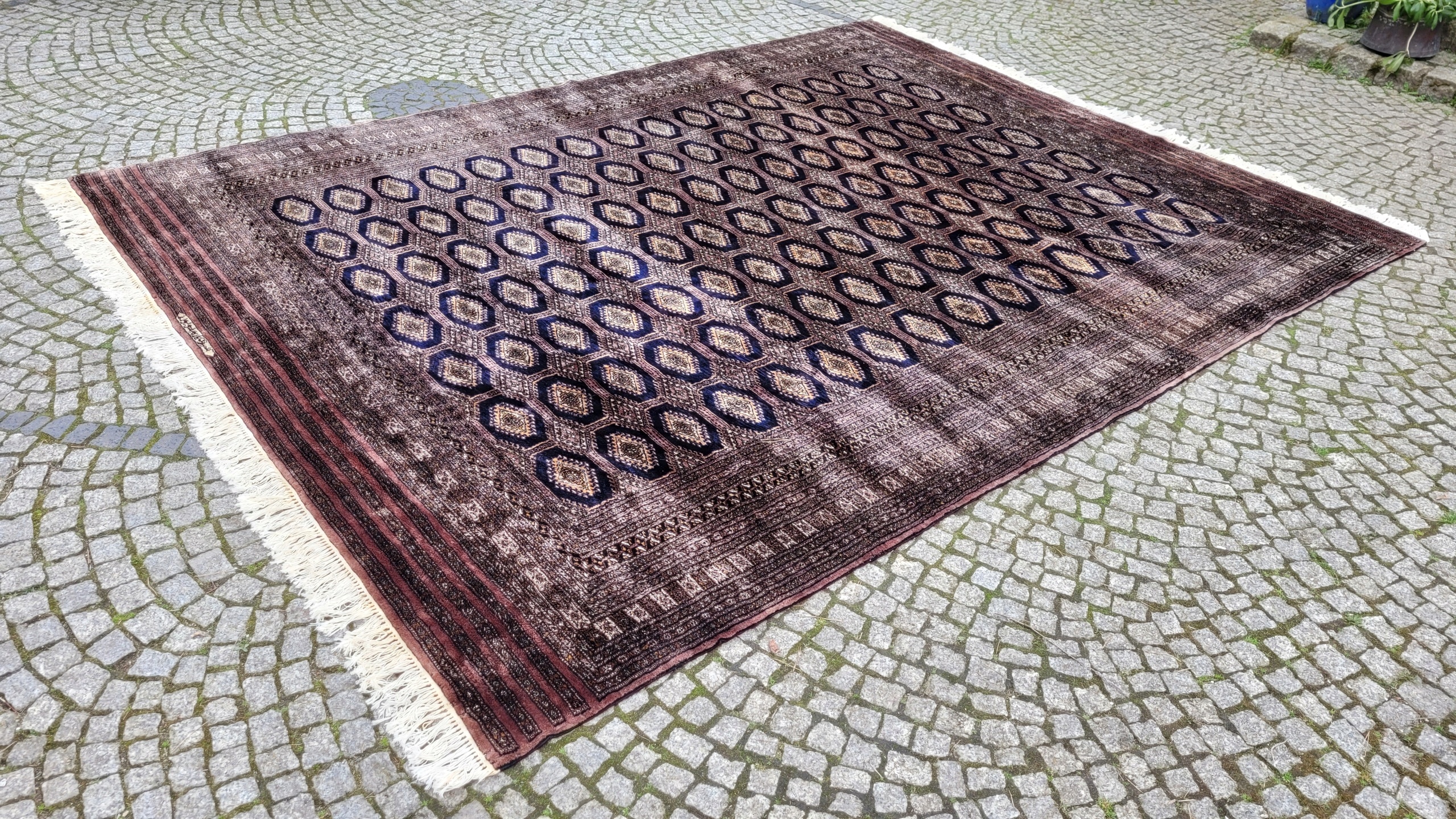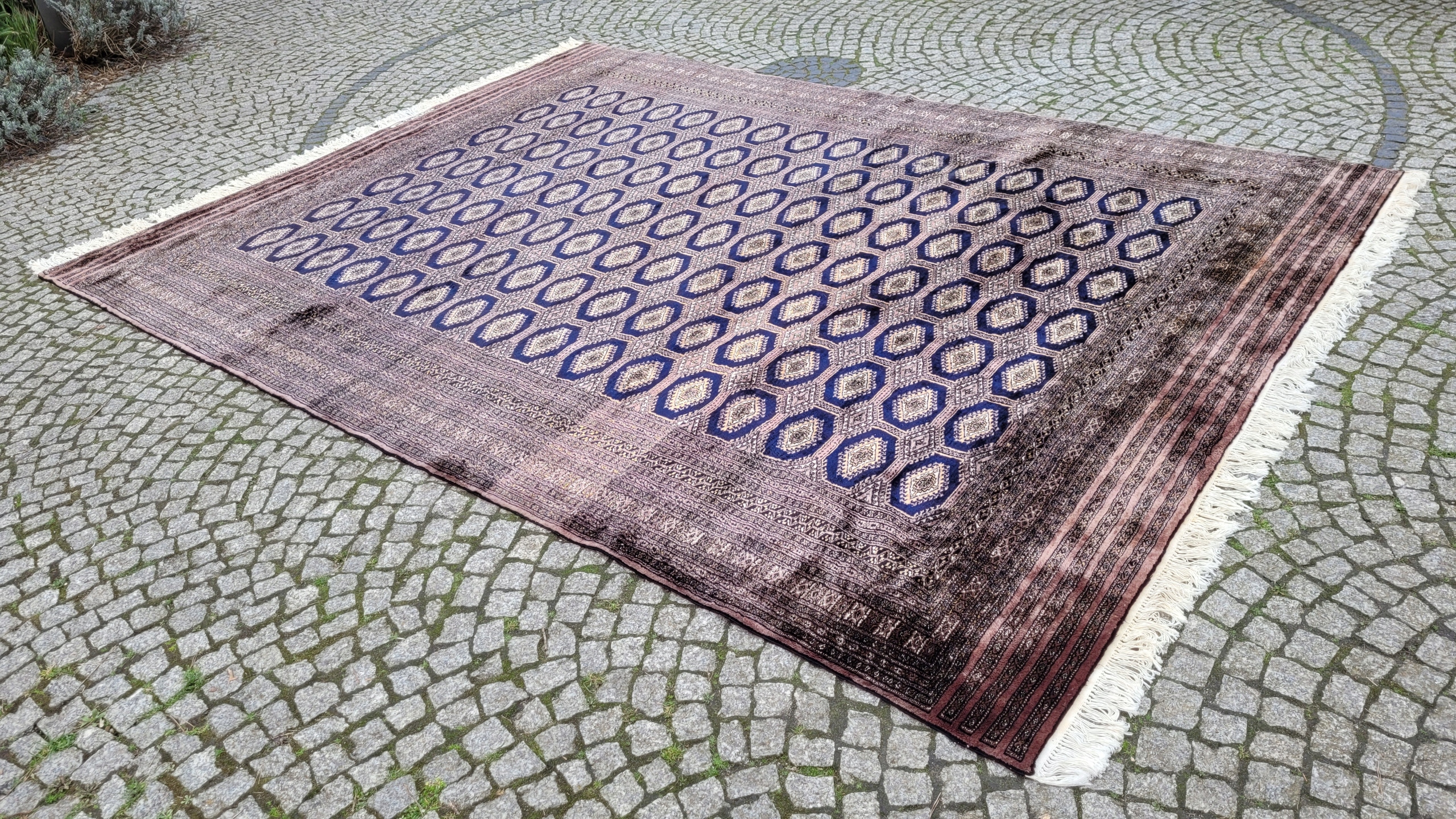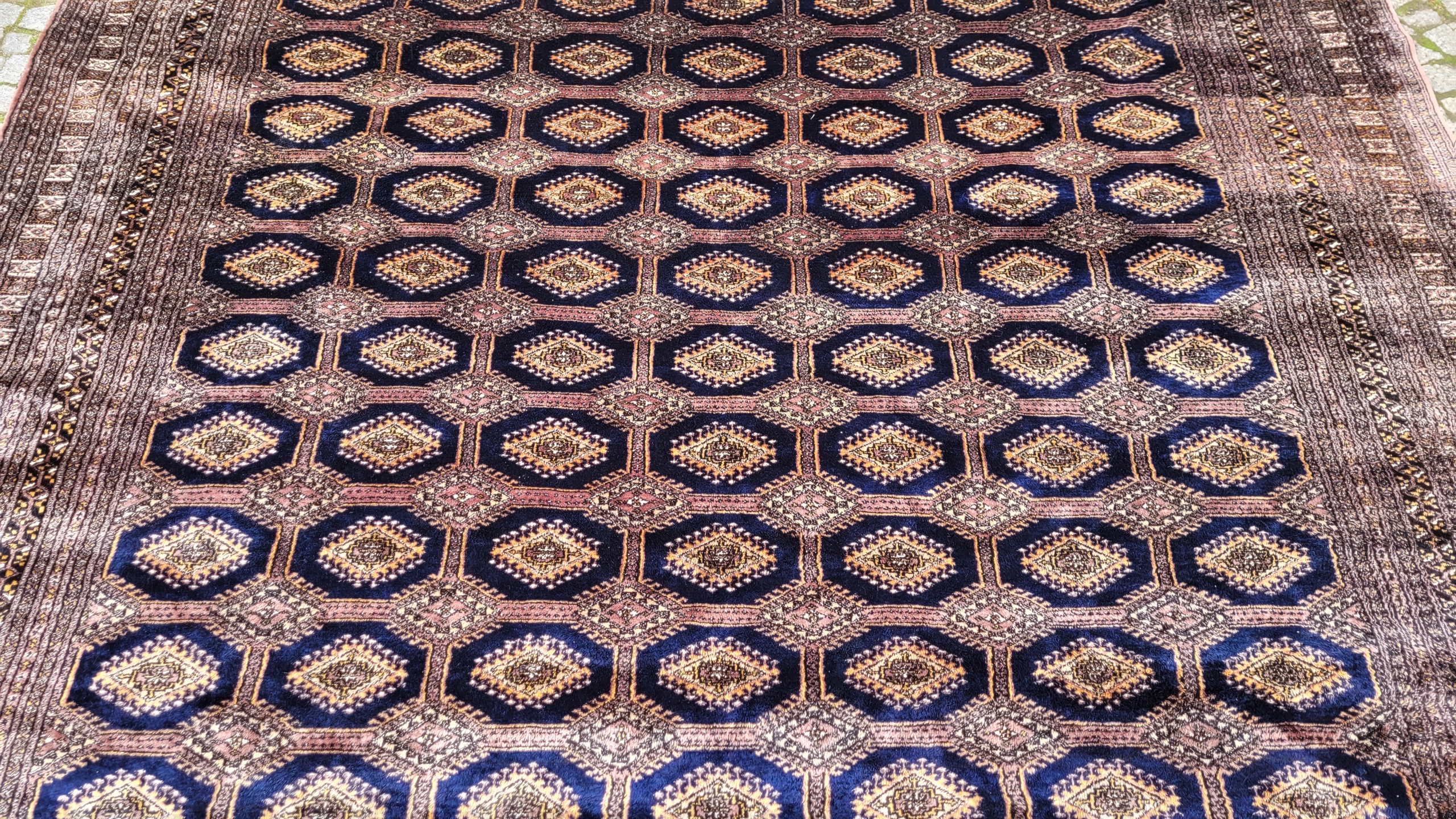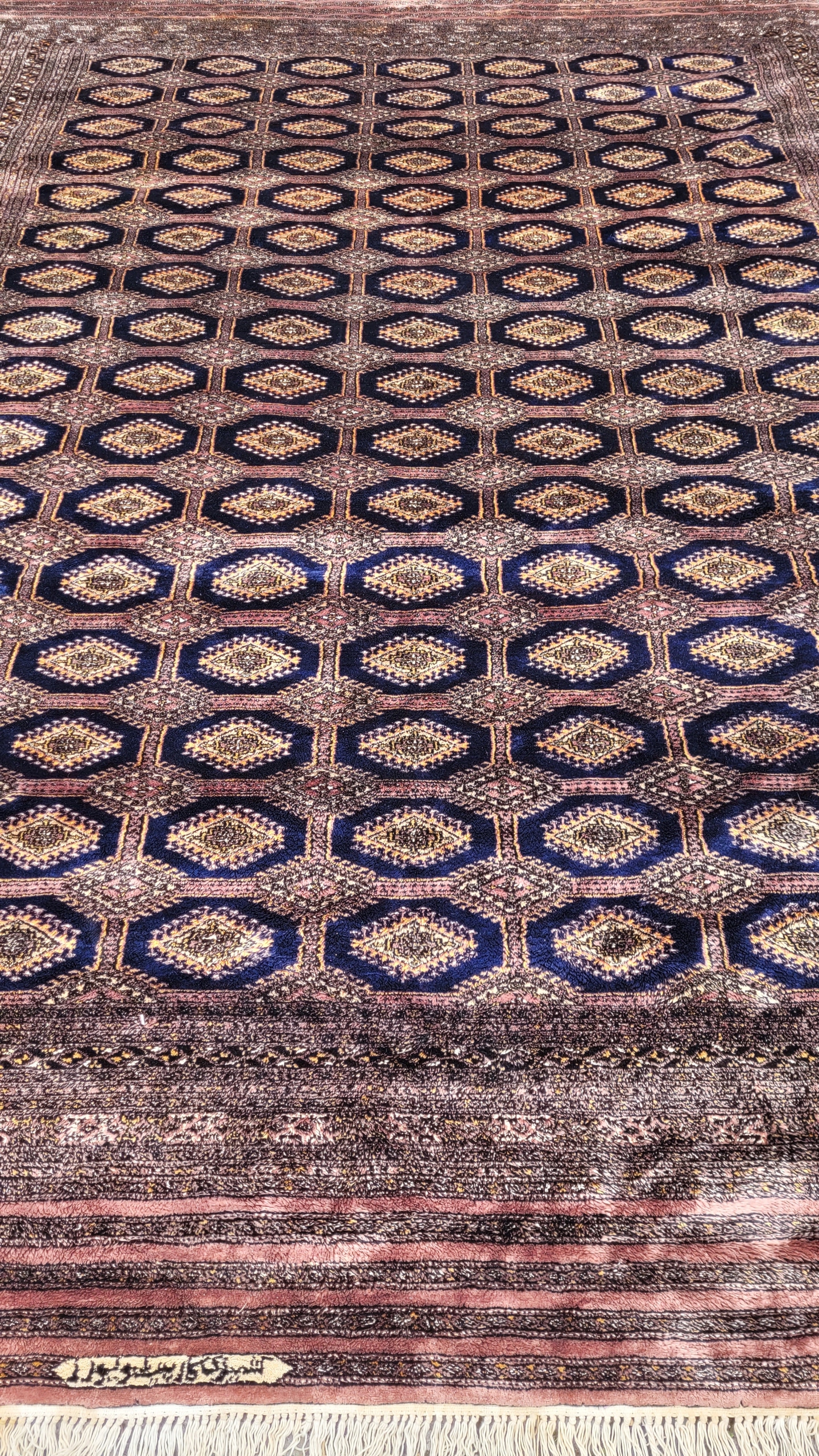 Східний, підписаний бухарський килим. Виткана вручну з полірованої вовни найвищої якості. Характеризується компактним, приємним на дотик, блискучим флісом і красивими кольорами та візерунками. Він у дуже хорошому стані, видно на фотографіях.