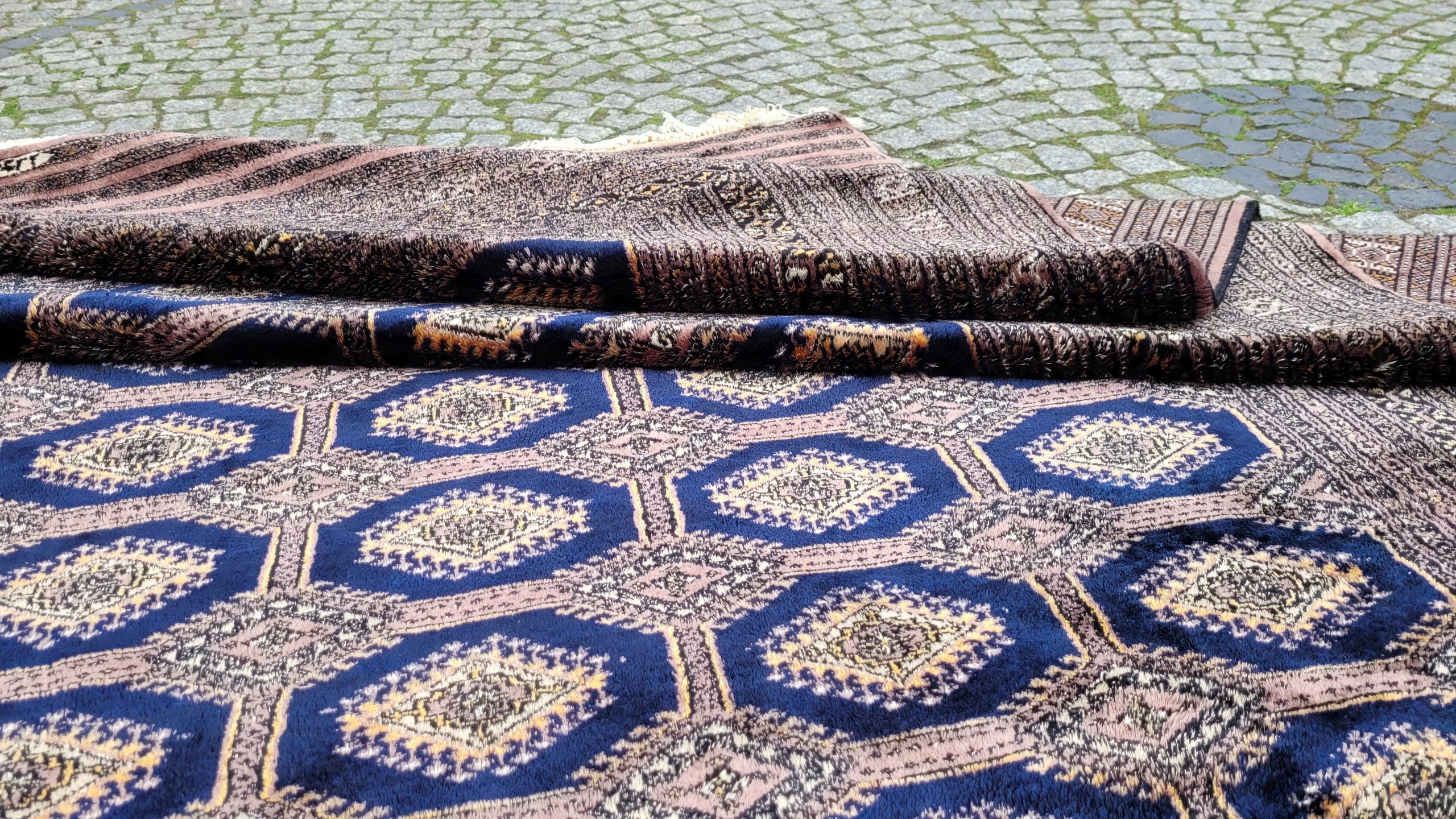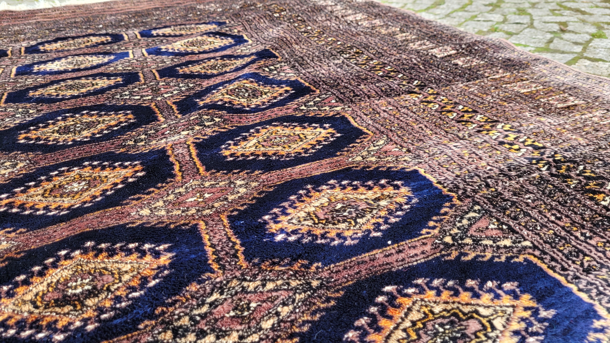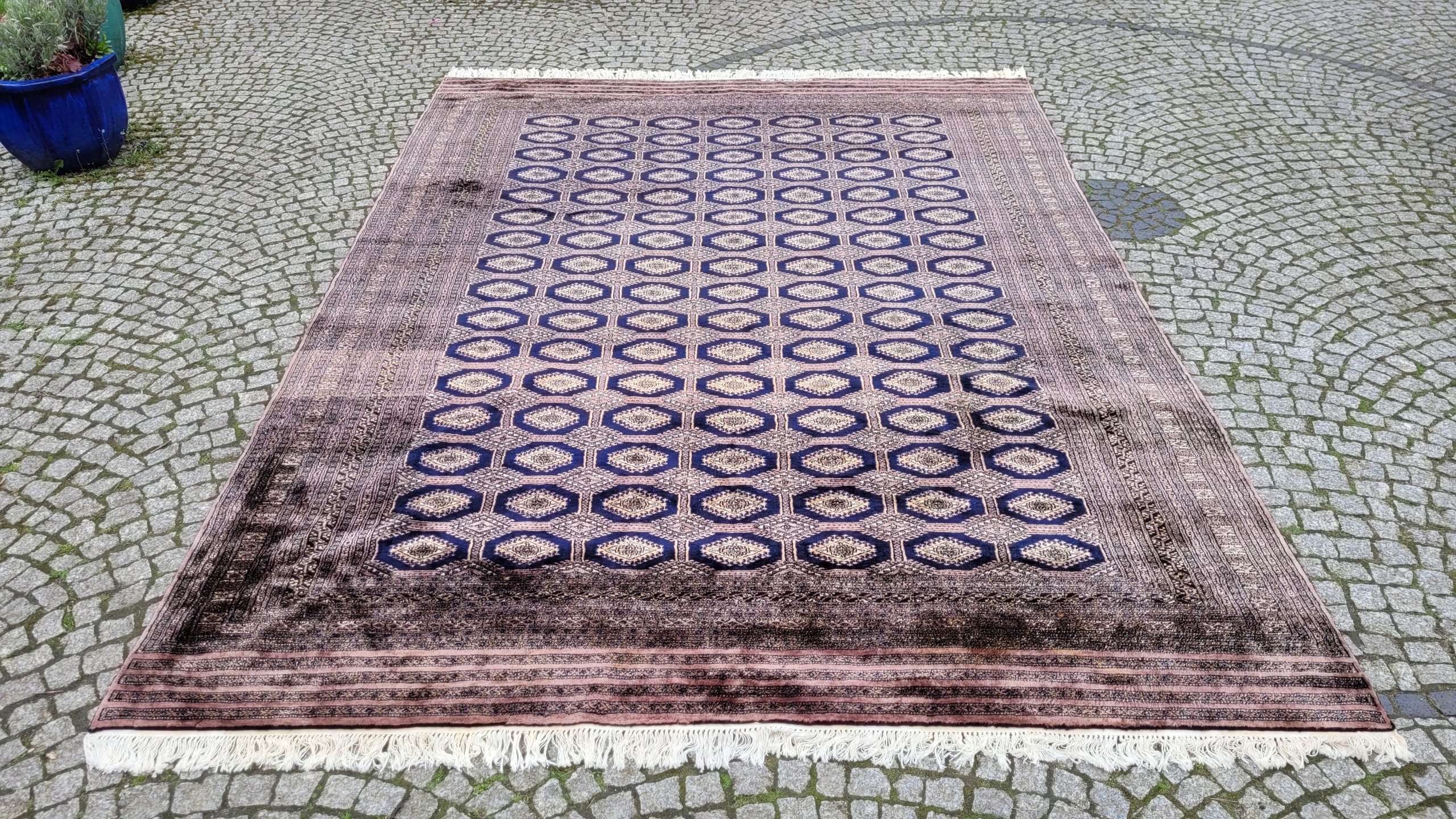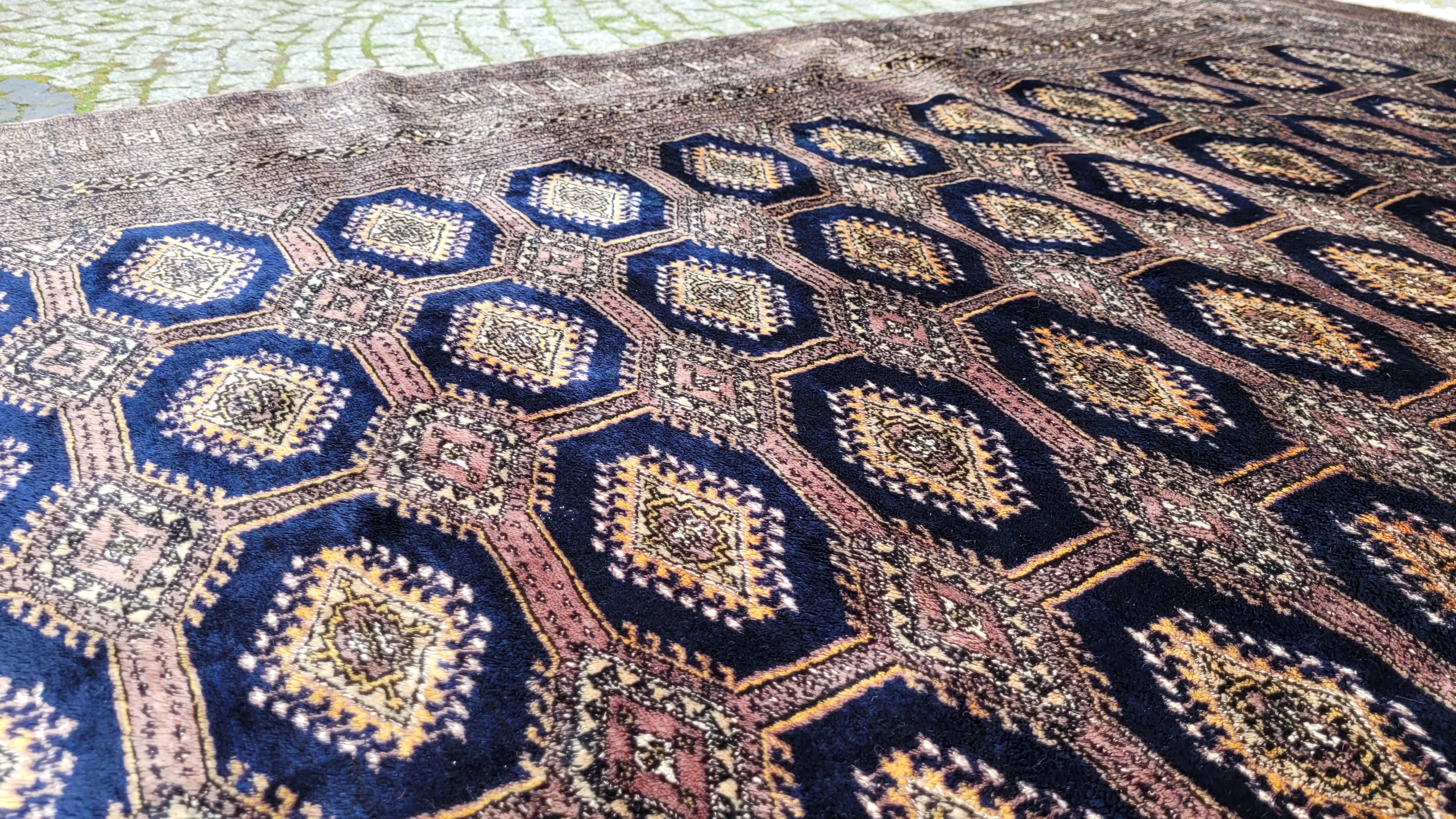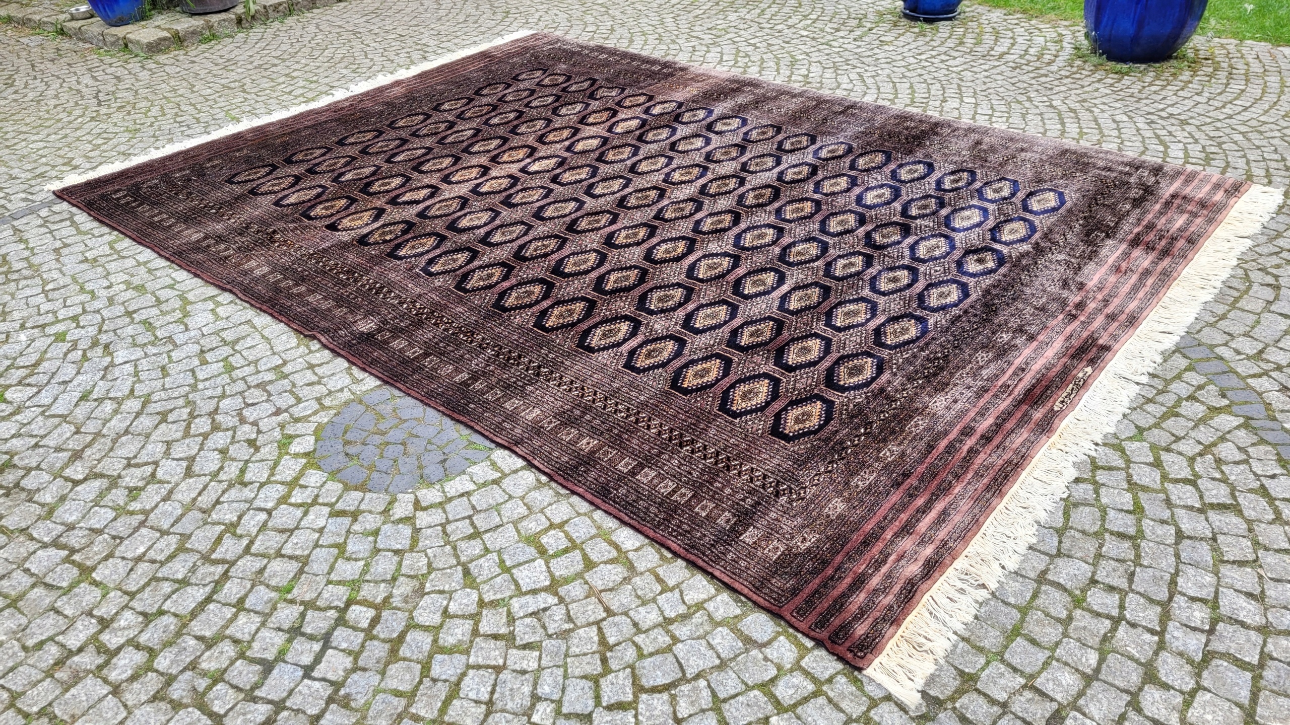 Східний, підписаний бухарський килим. Виткана вручну з полірованої вовни найвищої якості. Характеризується компактним, приємним на дотик, блискучим флісом і красивими кольорами та візерунками. Він у дуже хорошому стані, видно на фотографіях.