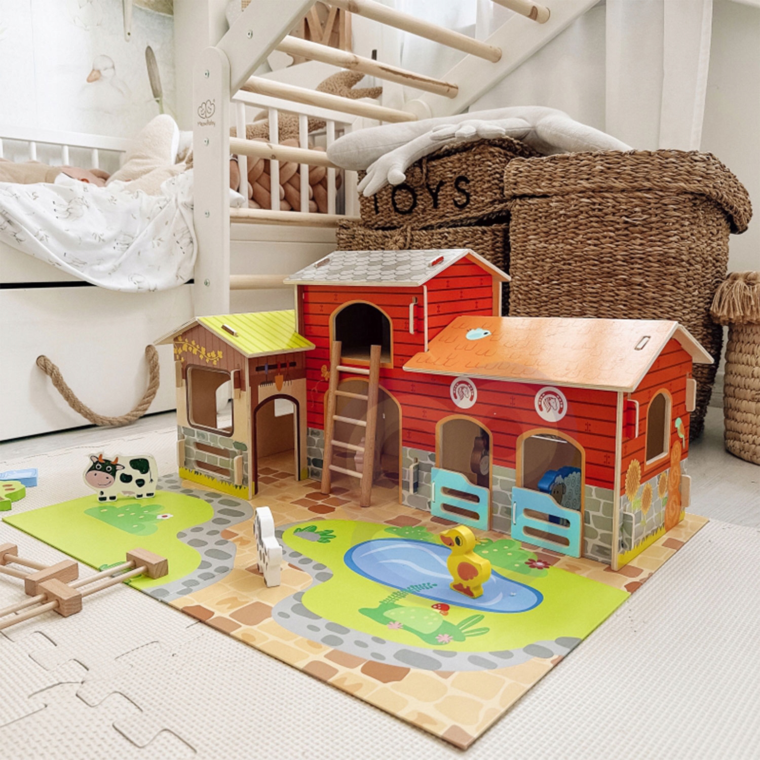 - Набір містить 18 елементів, включаючи фігурку: кінь, курка, свиня, вівця, собака, качка, дерева та сіно.