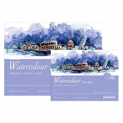 Fabriano Watercolor Torchon – блок для акварелі та фарб на водній основі. Безкислотний папір з ніжною текстурою «хмара». Виготовлений з целюлози та 25% бавовни.