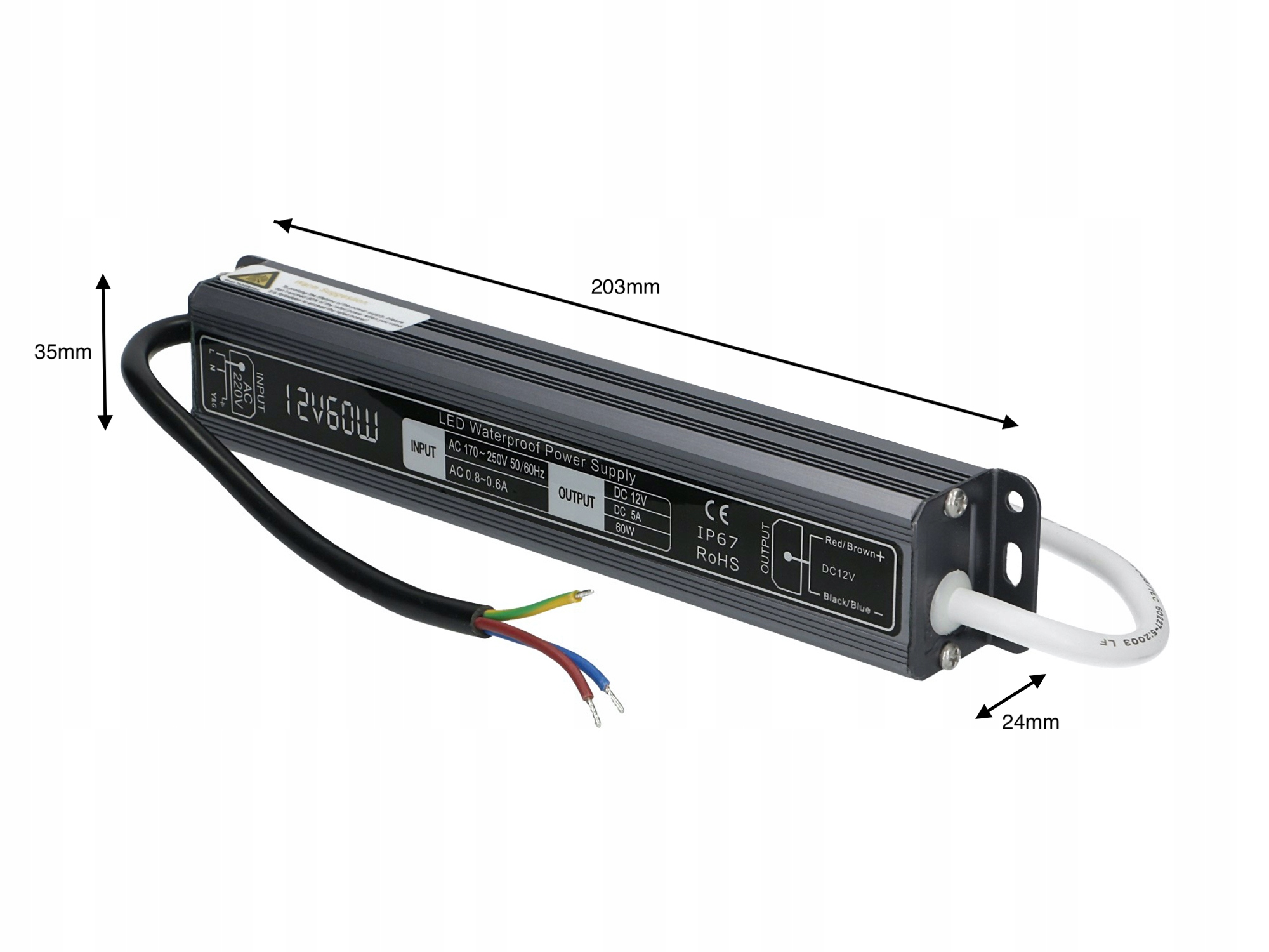 - Водостійкий світлодіодний блок живлення потужністю 5 A = 60 Вт, призначений для внутрішнього та зовнішнього застосування, де він може бути підданий впливу погодних умов.
