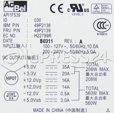 БЛОК ЖИВЛЕННЯ ACBEL API1FS39 FRU: 49P2139 560W x235 FV