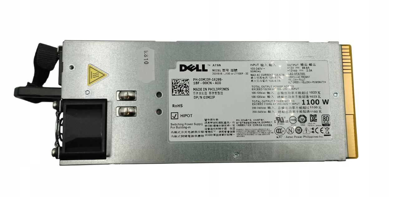 Пропоную оригінальний блок живлення Dell 03MJJP потужністю 1100W, призначений для сервера PowerEdge R810. Модуль демонтовано з повністю справного блоку і пройшов функціональні тести - блок живлення працює стабільно і готовий до подальшого використання в якості заміни або елемента резервної конфігурації на корпоративному сервері.
