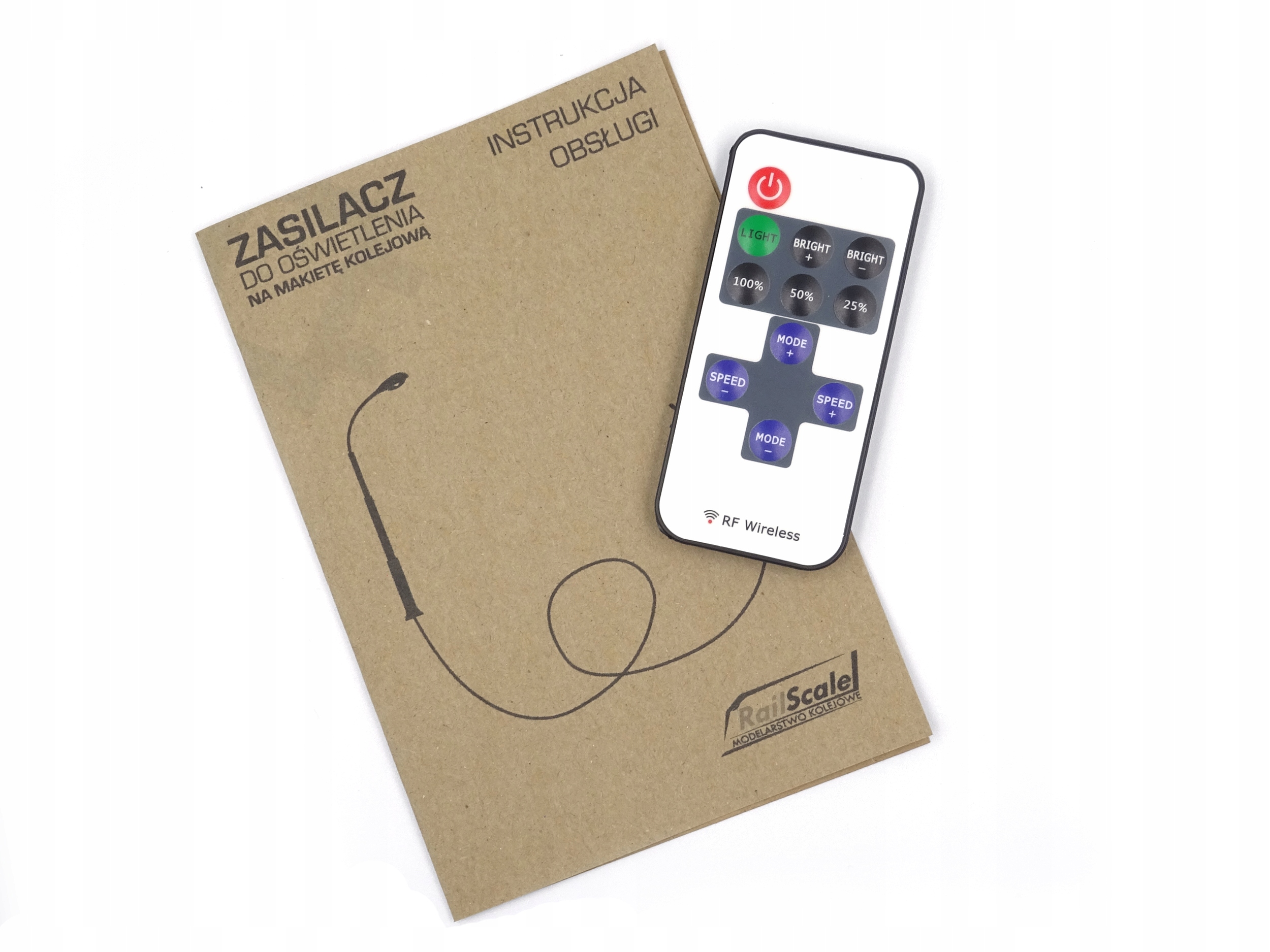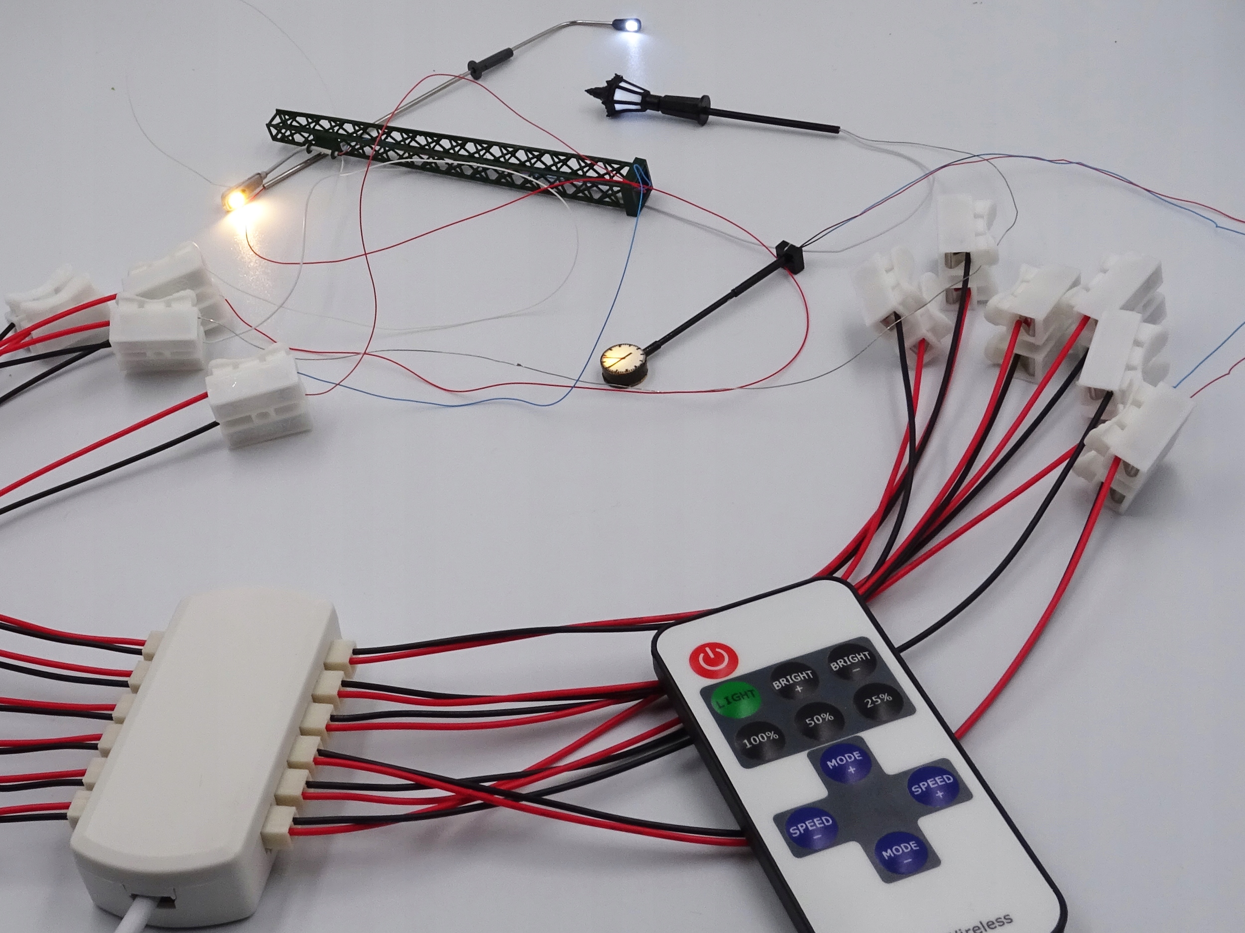 Набір для живлення освітлення макета залізниці або діорами. Блок живлення дозволяє підключити до 12 ліхтарів. Завдяки швидкому роз'єму для підключення освітлення не потрібна пайка. За допомогою пульта дистанційного керування, що входить у комплект, ми можемо дистанційно керувати освітленням і використовувати багато спеціальних ефектів, таких як стробоскоп, спалах тощо.
