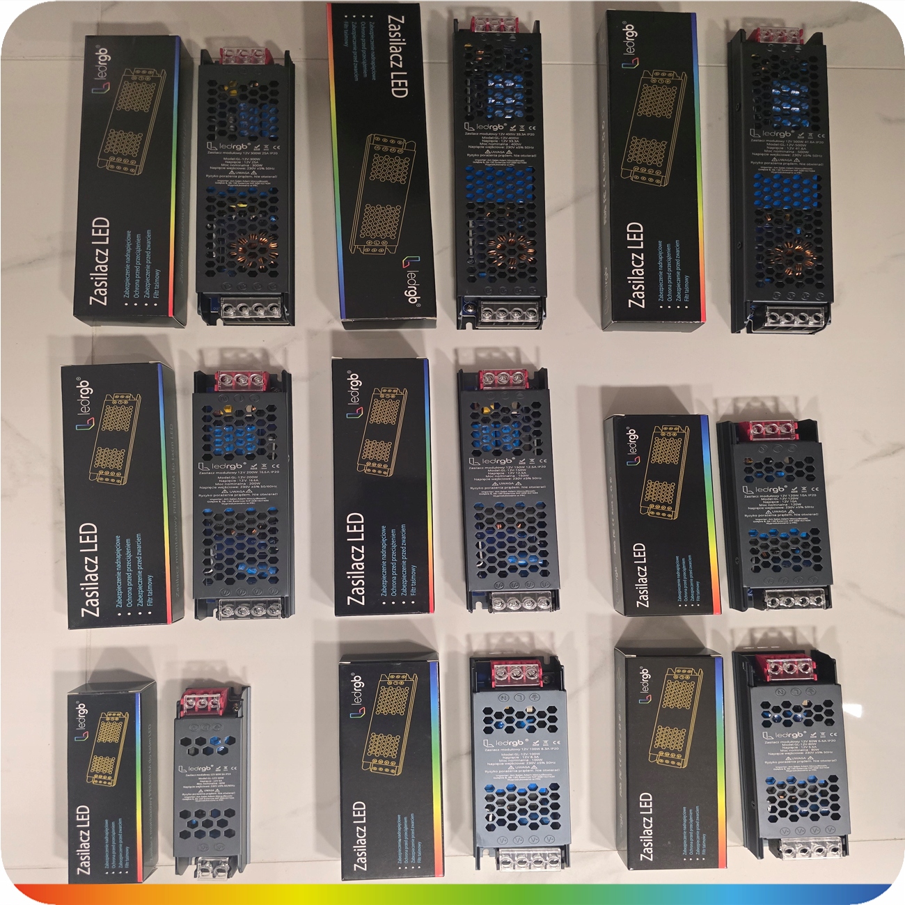 На фото показана повна лінійка наших блоків живлення LEDRGB PREMIUM, створених для професійних світлодіодних інсталяцій.