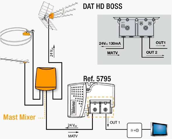 24 В (130 мА) домашнє джерело живлення, що передає живлення через вхідний коаксіальний кабель, одночасно пропускаючи телевізійний сигнал. Використовується в установках для живлення щоглових підсилювачів або системи BOSS. Оснащений розгалужувачем для створення двох виходів.