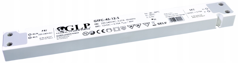 БЛОК ЖИВЛЕННЯ ПОСТІЙНОЇ НАПРУГИ LED 12V 45W PFC SLIM GLP